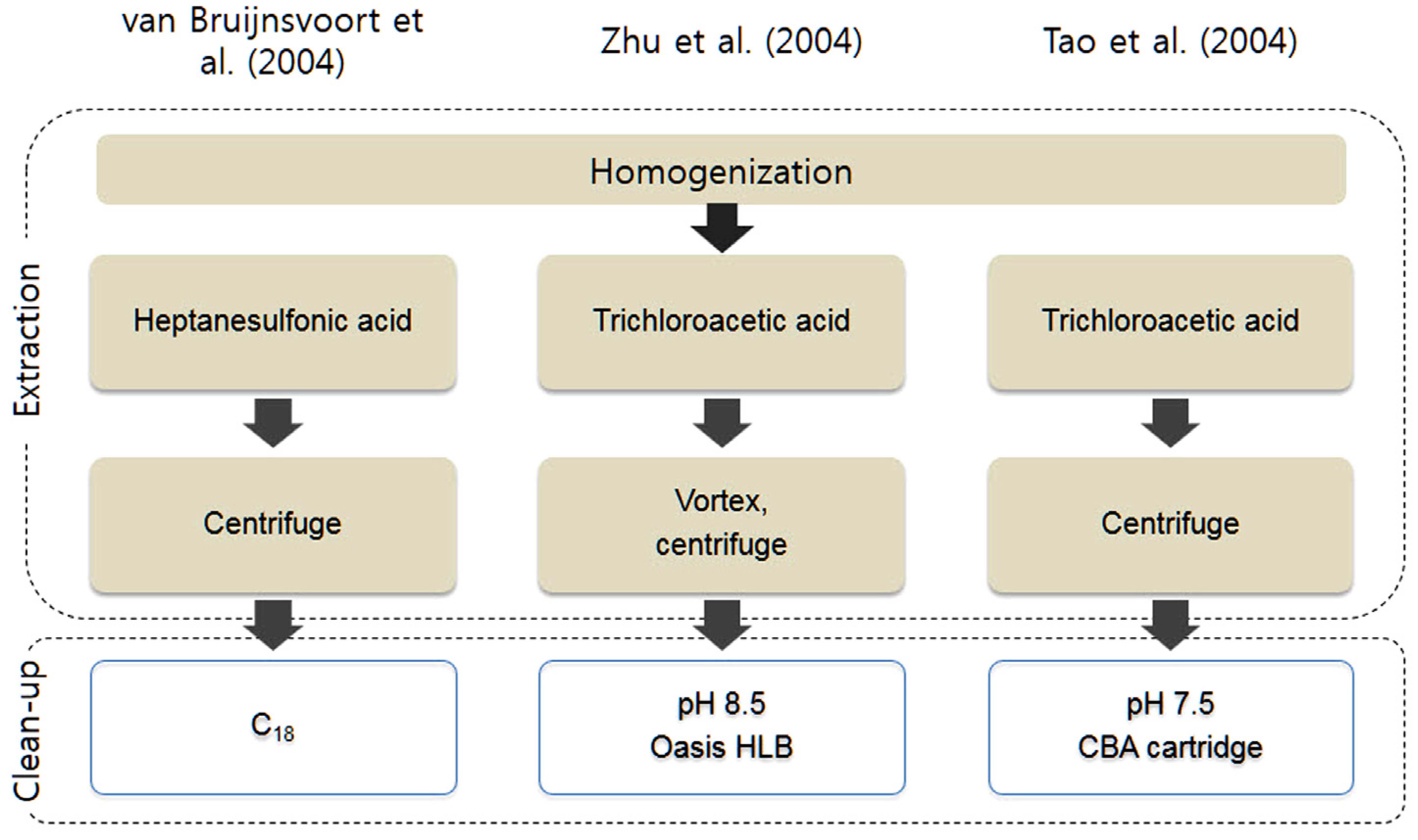 U. S. EPA (2007)Shin et al. (2012)이 제안한 방법들 모 두 기존의 연구를 바탕으로 하여 항생제를 그룹화하고 분석 방법을 제시하였다. 따라서 분석 가능한 항생물질의 종류가 매우 유사하며 그 범위도 베타-락탐, 플로로퀴놀론, 매크로 라이드, 설폰아마이드, 테트라사이클린 등으로 제한적이었다. 특히, Shin et al. (2012)이 제안한 방법은 대상 시료로부터 여러 종류(계열)의 항생제를 검사하고자 할 때 수회에 걸쳐 각기 다른 전처리 과정을 수행해야 하기 때문에 많은 시간과 노동력을 필요로 하는 단점을 가지고 있다. 실제로 본 연구 에서 선정된 항생제를 검출할 목적으로 EPA method 1694 를 적용한 경우 시료 당 1회의 전처리를 통해 16종의 잔류 항생제 농도를 측정할 수 있는 반면, Shin et al. (2012)의 방법을 적용하는 경우 4가지의 전처리방법을 적용해야 15종 의 잔류항생제 농도를 측정할 수 있었다.