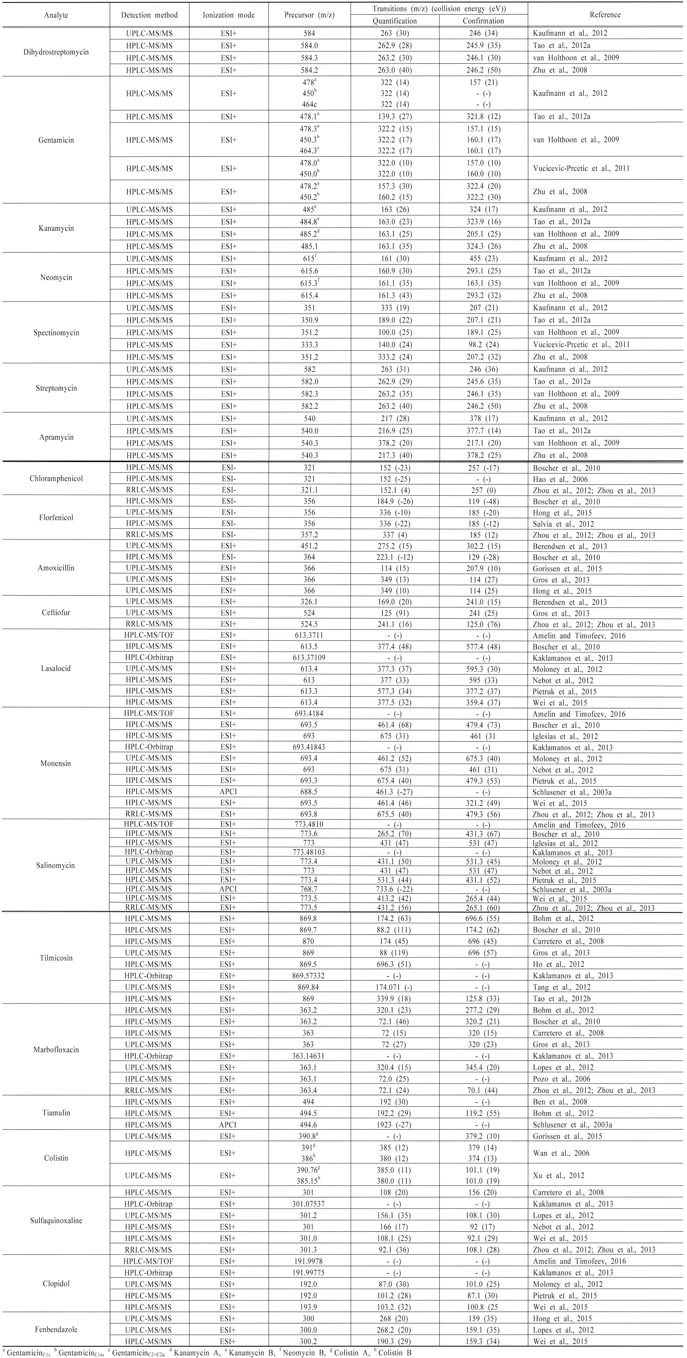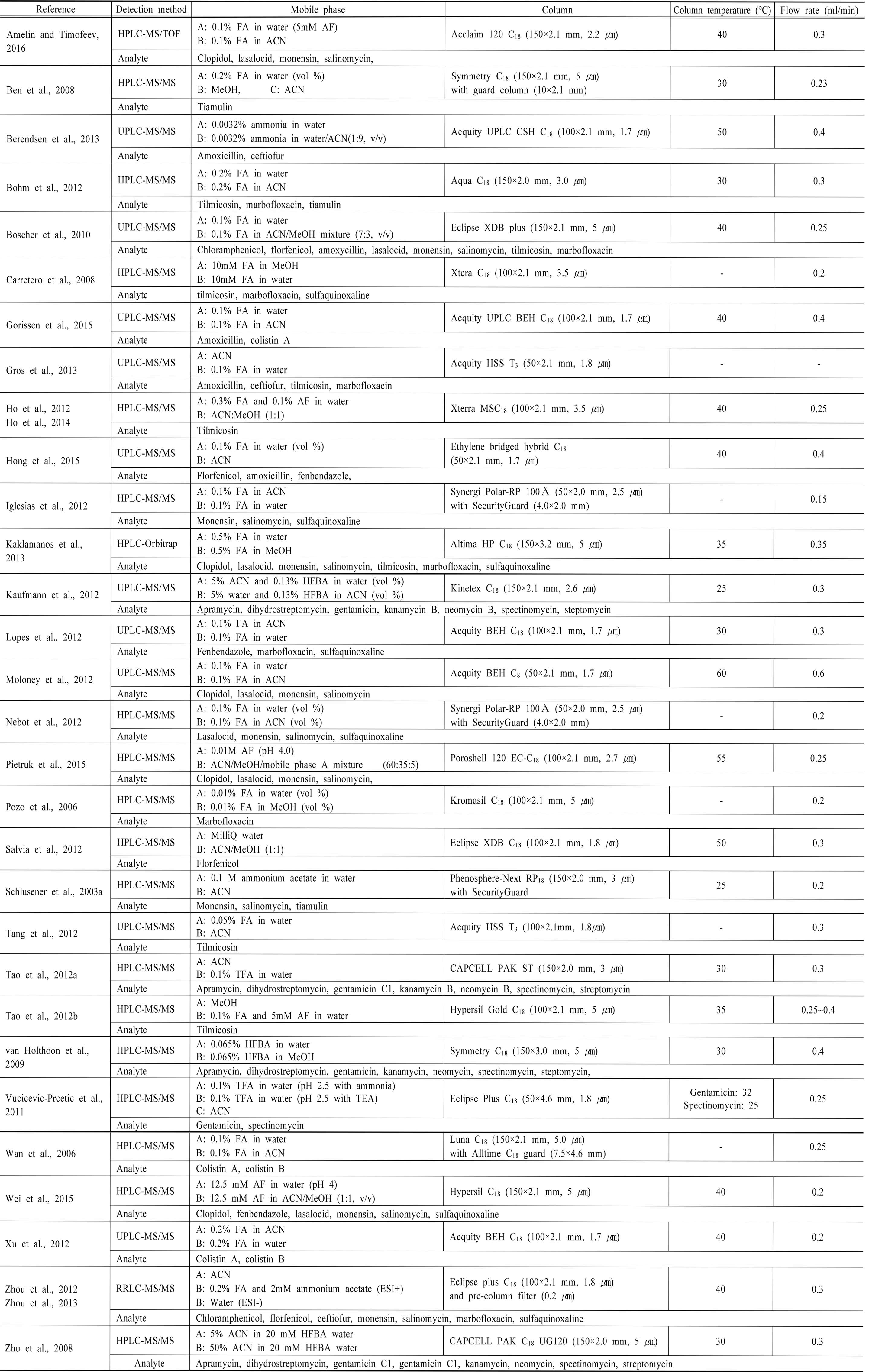 Table 2는 대상 항생제에 적용한 분석 방법과 크로마토 그래피에 사용된 컬럼, 이동상의 종류를 나타낸다. 항생제 계열에 따른 큰 차이가 관찰되지는 않았으며 대부분의 문 헌은 비극성 고정상과 극성 용매를 이동상으로 사용하는 역상 C18 컬럼을 사용하는 것으로 조사되었으나 특정 계열 의 항생제를 분리하기 위한 목적으로 C8, phenyl 컬럼 또는 CAPCELL PAK ST 컬럼이 적용된 연구도 있다.