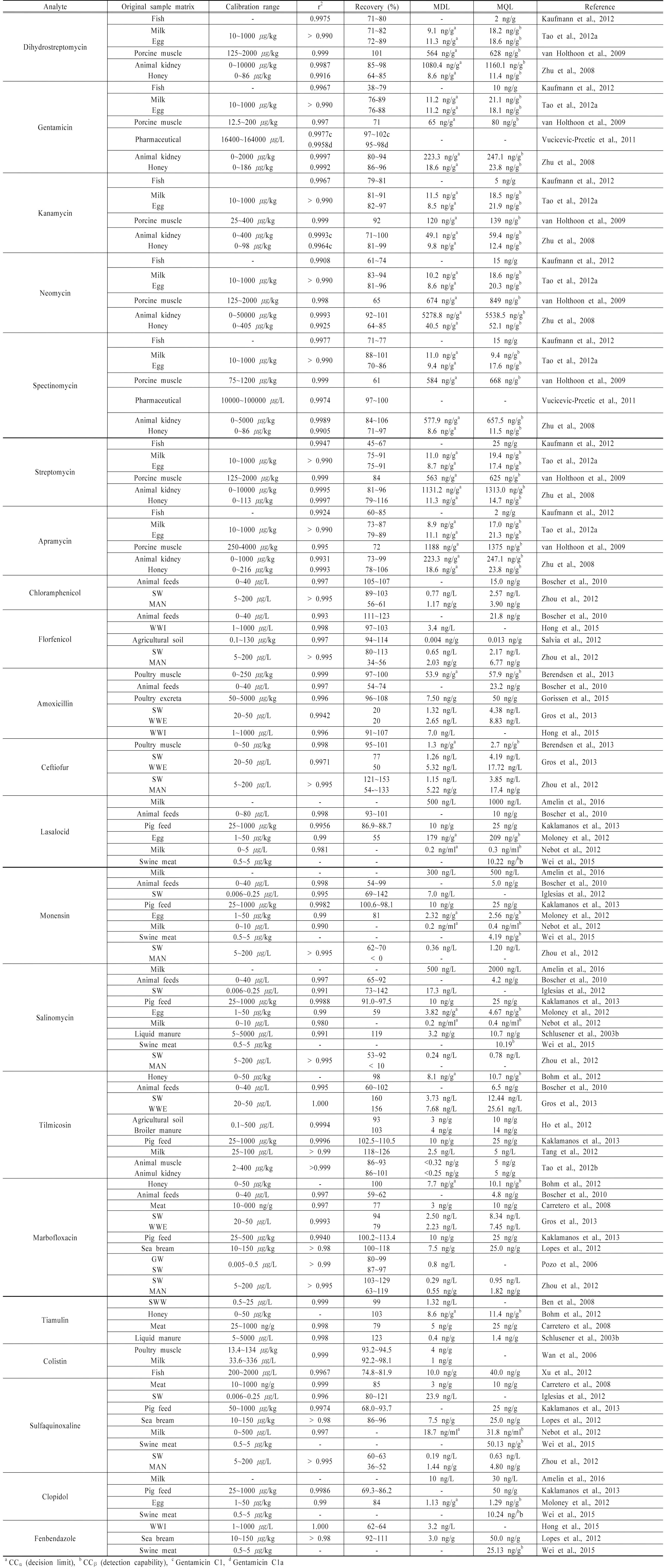 개발 및 적용된 분석방법에 대한 검증을 위해 각 문헌에서 제 시한 표준용액의 선형 구간(linear range), 상관계수(correlation coefficient, r2), 회수율(recovery), 시험방법의 검출한계 및 정량한계 등을 비교하여 정리하였다. 검출한계(limit of detection, LOD)는 검출 가능한 최소량을 의미하며 정확한 정량은 불가능한 농도이다. 기기에 시료를 직접 주입하여 측정되는 기기검출한계(instrument detection limit, IDL)와 전처리를 포함한 전체 분석과정과 매질의 특성을 고려하여 결정되는 방법검출한계(method detection limit, MDL)로 구 분한다(NIER, 2011). 정량한계(limit of quantification, LOQ) 는 검출 한계보다 높은 농도로 정확한 정량이 가능한 가장 낮은 농도를 의미한다. 검출한계와 동일하게 기기정량한계 (instrument quantification limit, IQL), 방법정량한계(method quantification limit, MQL)로 구분하기도 한다(NIER, (2011). 아미노글리코사이드계열의 항생제를 대상으로 한 경우 검 출한계 및 정량한계를 대신하여 결정 한계(decision limit, CCα)와 탐지 역량(detection capability, CCβ)을(EU Commission, 2002) 계산하여 방법을 검증하는 경우가 많아 이에 대한 조사와 고찰을 수행하였다.