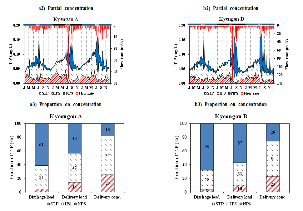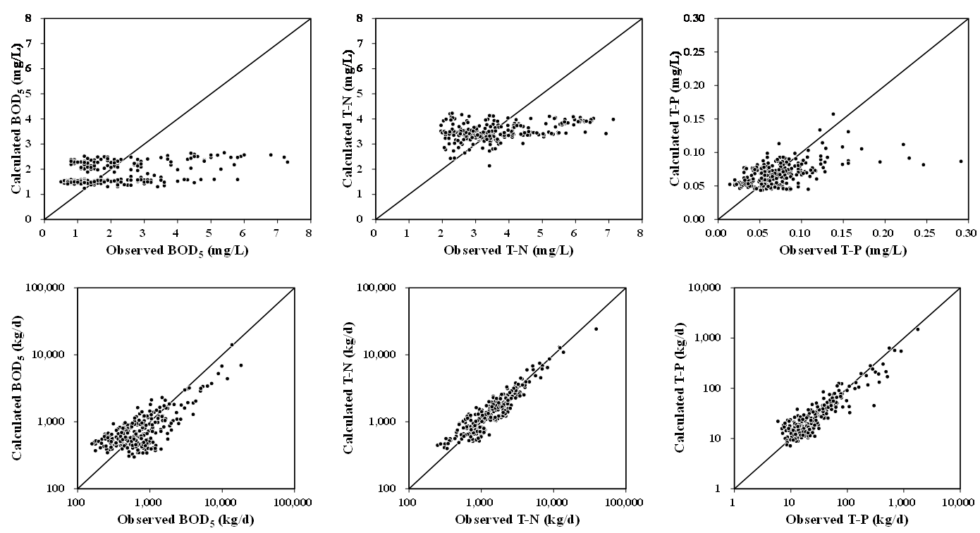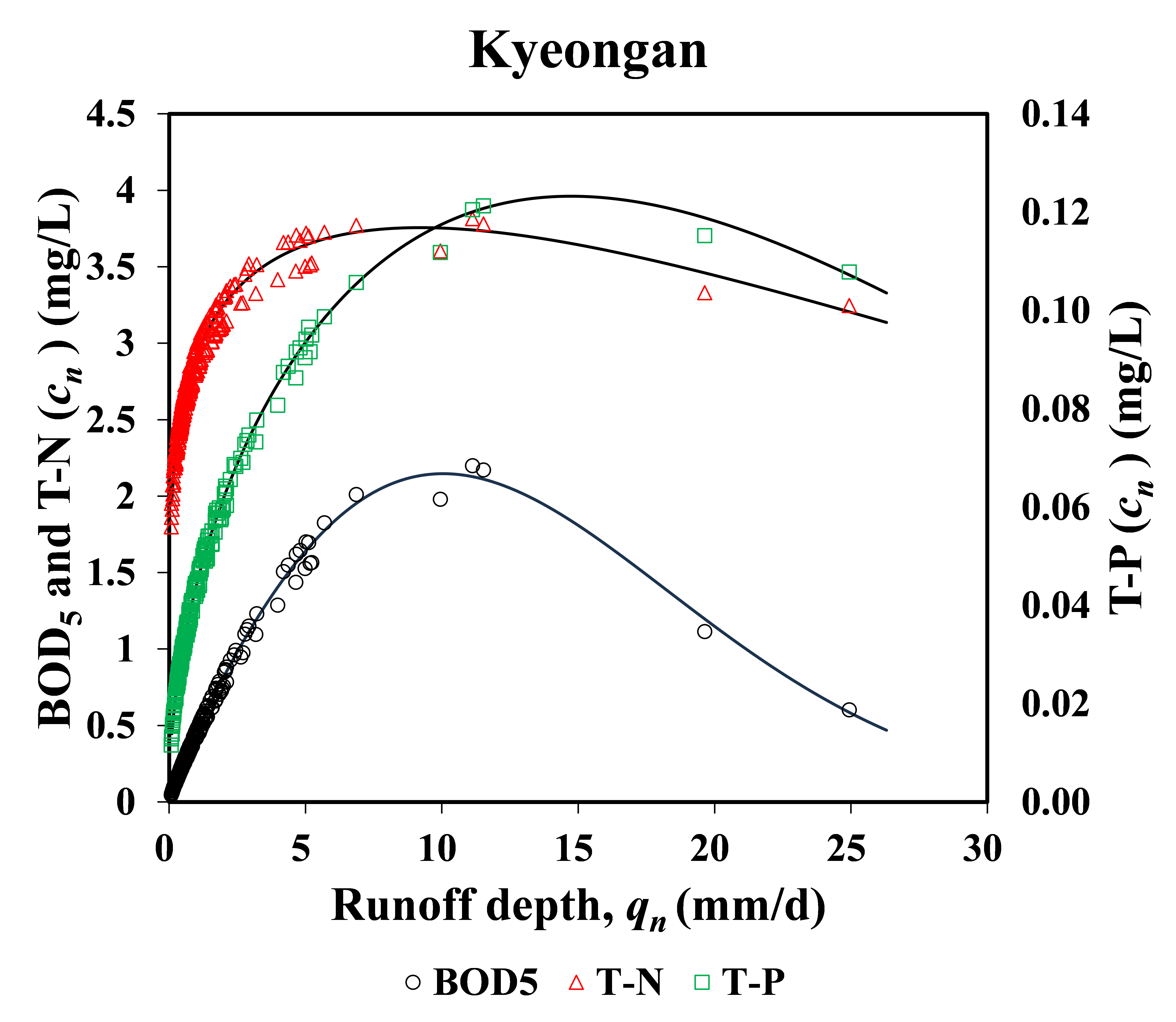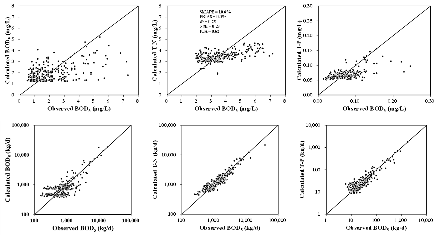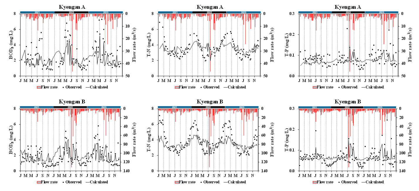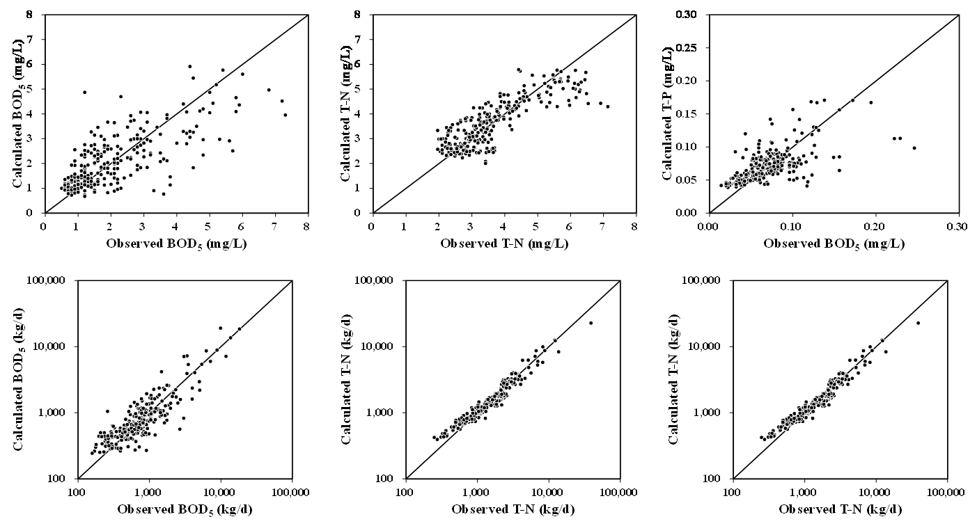 ๋ณธ ์ฐ๊ตฌ์์ ์๋ก์ด ์ ์๋๋ ๋ชจํ์ Cohn et al. (1992)์ ๋ก๊ทธ-์ ํ ๋ชจํ์ ์์ฑ๋ณ๋ก ์ธ๋ถํ์ฌ Kong et al. (2015)์ ์์ ์กฐํฉํ ๊ฒ์ผ๋ก(Table 2), ์ ๋ฌ๋ถํ(L, delivery load)-์ ๋(Q, flowrate)-๋ฐฐ์ถ๋ถํ(L, discharge load)-๊ณ์ ์ฑ(S, seasonality)์