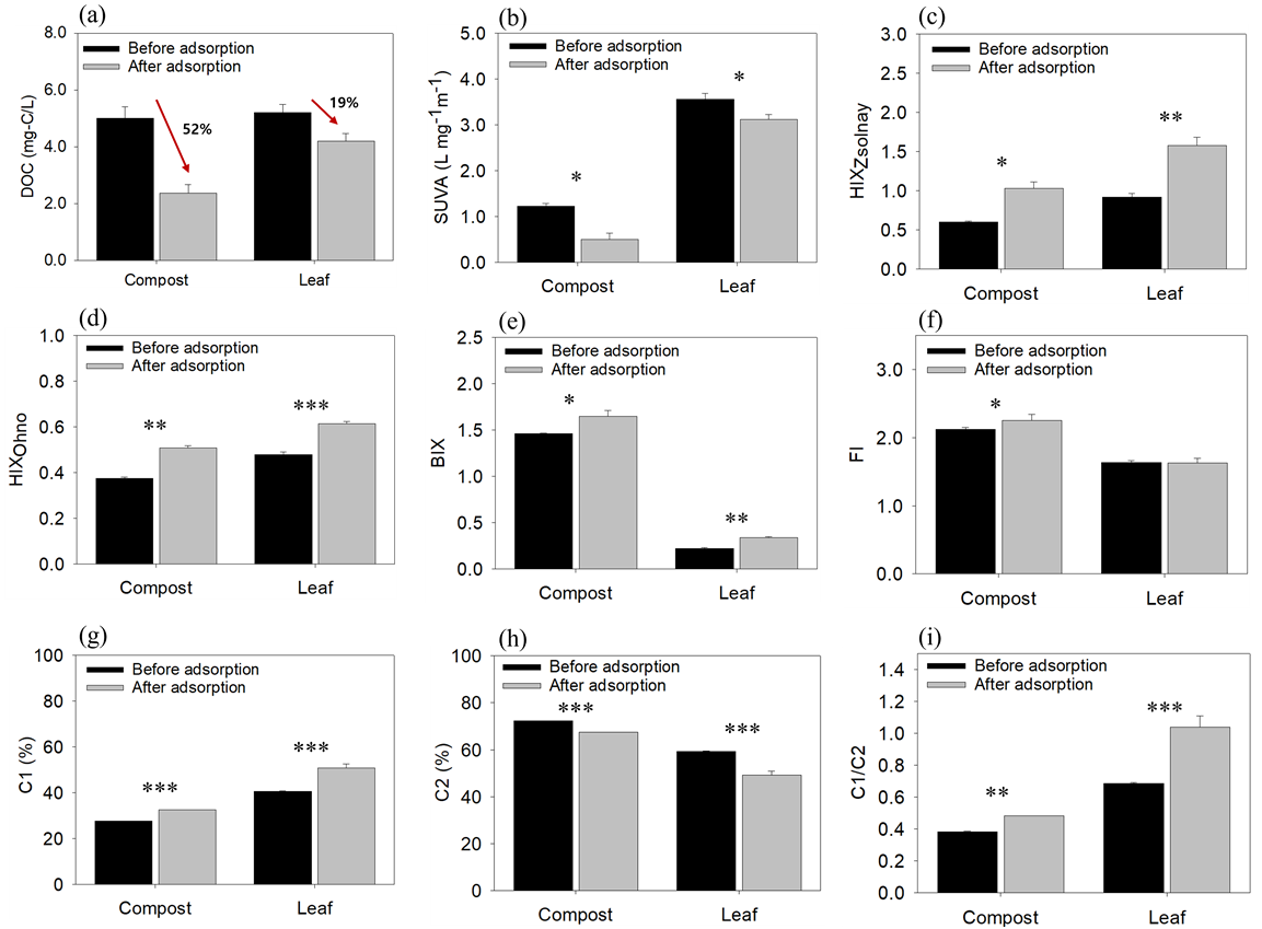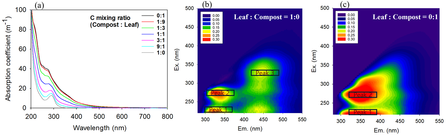 기원인 낙엽과 인위적 기원인 퇴비를 대조적 끝성분으로 설정하고, 다양한 혼합비 조건에서 토양 흡착 전후 DOM의 분광 지표 특성 변화를 비교한다.