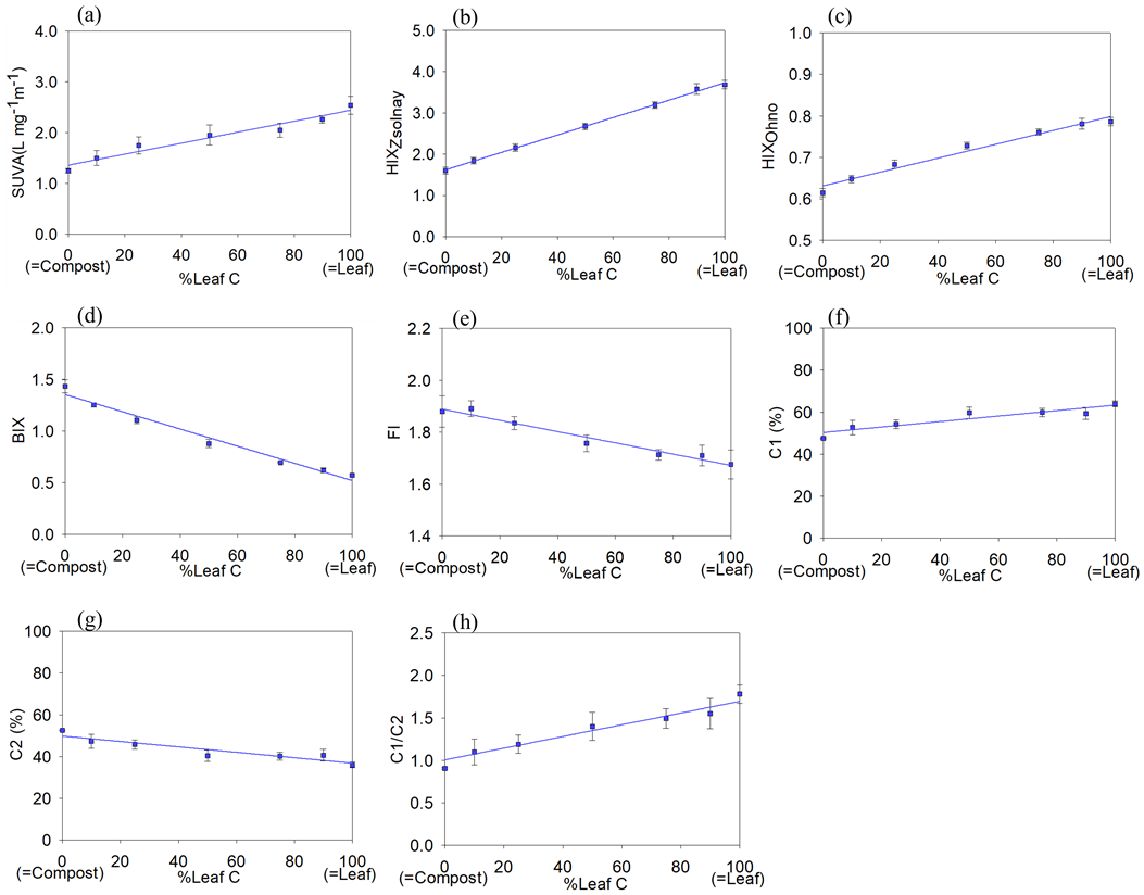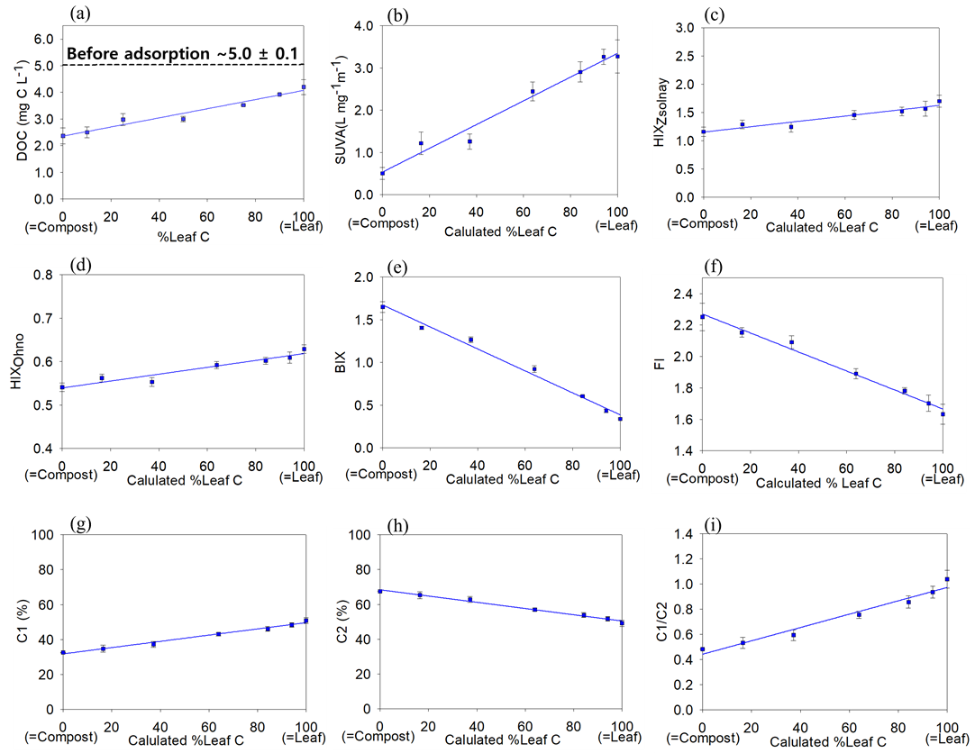 DOM을 기준으로 하여 0%, 10%, 25%, 50%, 75%, 90%, 100% 부피 비율로 퇴비 유래 DOM과 혼합 제조하였다(Lee et al., 2018; Yang and Hur, 2014). 이때, 혼합시료 중 낙엽 DOM 0%는 퇴비 DOM 100%를 의미한다.