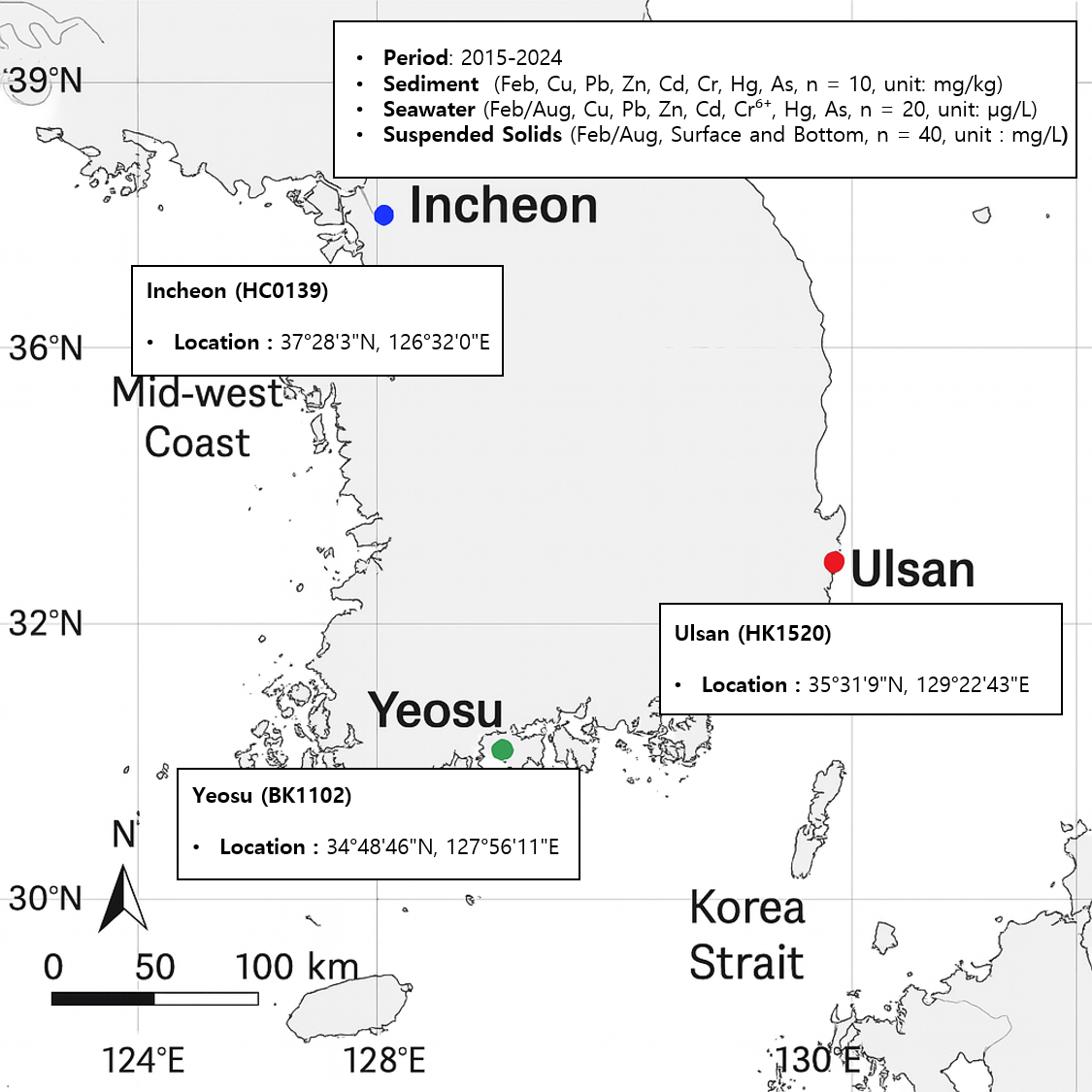 해당한다. 이 일대에는 대형 조선소와 석유화학단지, 비철금속 제련 공장들이 밀집해 있어 해양으로 중금속이 유입될 가능성이 상시 높은 지역이다(Ra et al., 2014; Sun et al., 2015). 여수 정점(BK1102; 34°48’46"N, 127°56’11"E)은 남해 여수국가산업단지와 여수 신항 주변 해역으로, 대규모 석유화학 및 정유