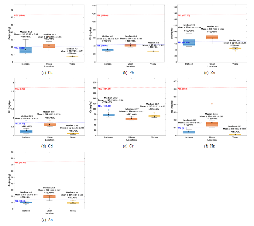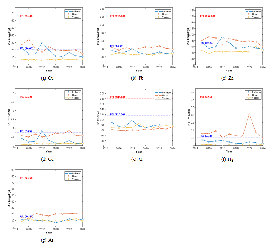 퇴적물 중금속 오염 수준 평가는 미국 NOAA와 캐나다 CCME에서 제시한 TEL 및 PEL 기준을 바탕으로 수행하였다(MacDonald et al., 2000). 해수 중금속 농도 평가는 해양수산부의 해양생태계 보호 기준을 적용하였다. 여기서 단기 기준은 일시적 고농도 노출에 대한 허용 상한선이고, 장기