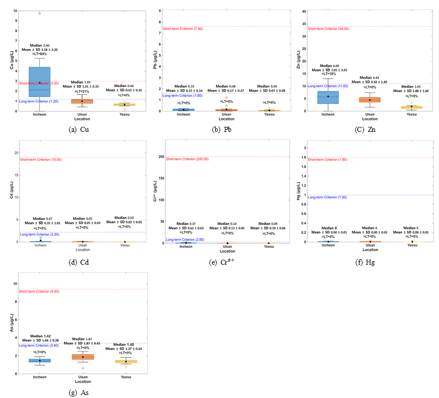 연구에서도 해당 값을 그대로 사용하였다. 해수 시료의 중금속 농도는 Cu, Pb, Zn, Cd, Cr⁶⁺, Hg, As 등 7개 항목에 대해 µg/L