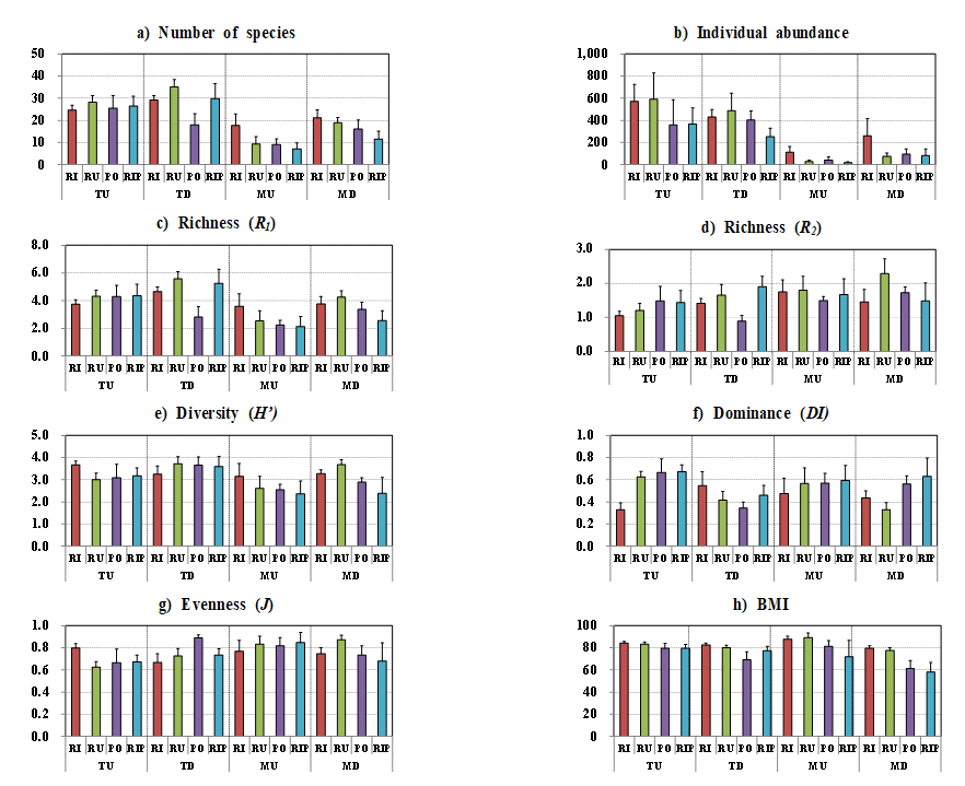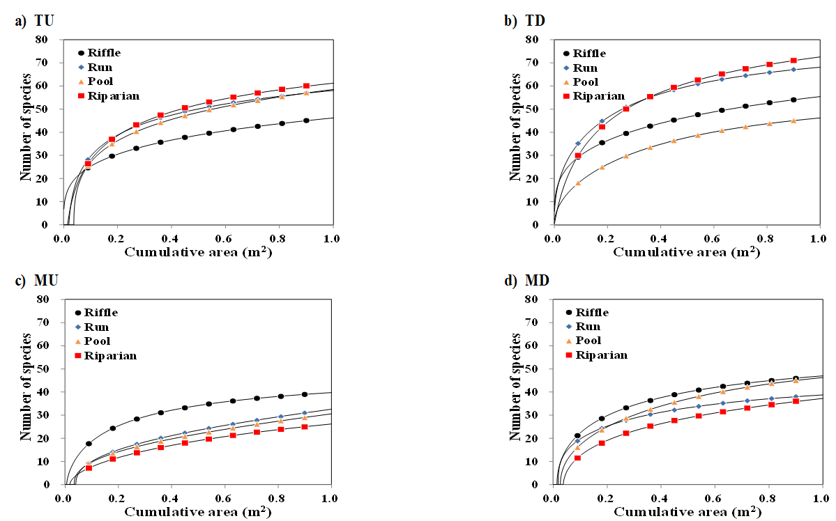 MD > MU > TD > TU 순이었다. 이는 하천 규모가 클수록 종다양성에 대한 수용력이 높다는 것을 시사한다.