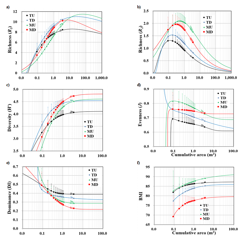 최적의 적합도를 보이는 모형을 적용하여 식 5로부터 도출된 $R_{1}$의 최대값에 해당하는 조사면적은 MU (65 m2), TD (17 m2), TU (13 m2), MD (7 m2)의 순으로 컸다(Fig. 8). $R_{1}$은 0.09∼0.27 m2의 작은 조사면적에서는 TD>TU>MD>MU의 순으로 컸지만 외삽 구간에서는 MU>TD>MD>TU의 순이었다. $R_{2}$의 최대값은 조사면적이