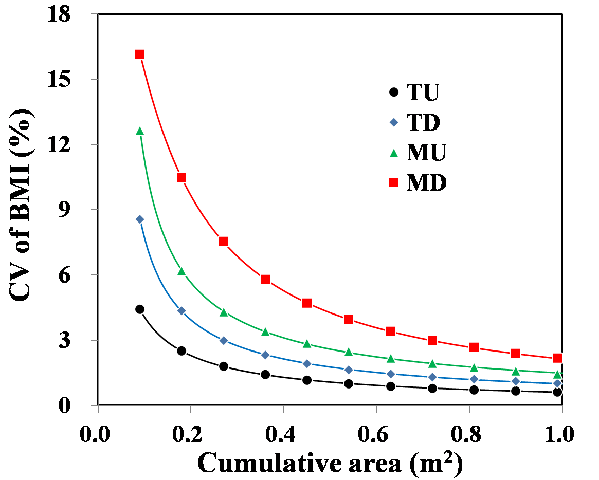 다른 지수와 달리 지점별 BMI 값의 순위는 모든 조사면적 구간에서 유지되었으며 최대 BMI는 MU(91.9)>TU(87.3)> TD(85.9)>>MD(79.9)의