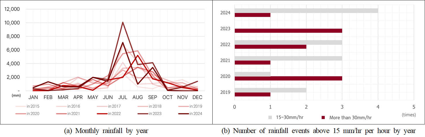 2019년부터 2024년까지의 강우 강도 변화를 분석하여 Fig. 1과 같이 제시하였다. 이때 전체 강우량은 집중호우 기간의 변화를 분석하고, 도시 침수 발생의 주요 요인으로 꼽히는 강우 강도는 기상청에서 정의한 강한