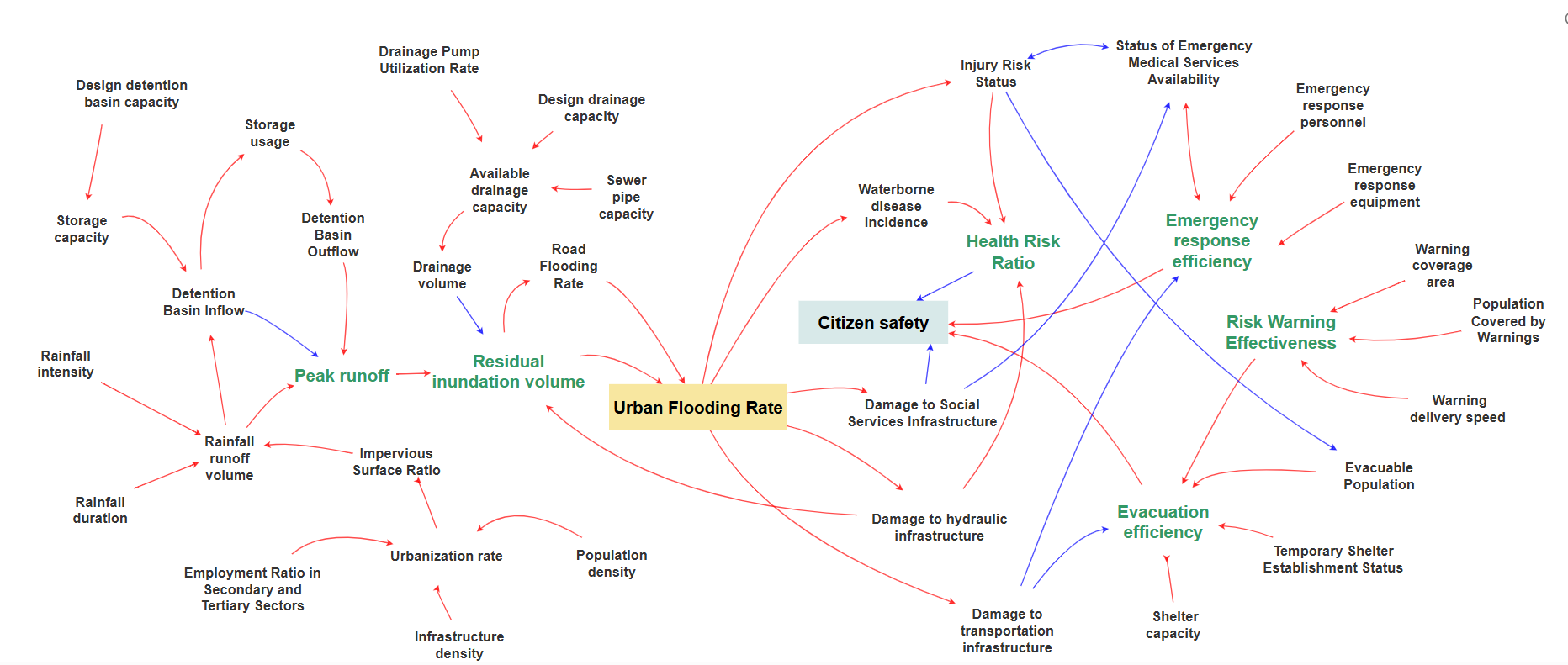 적용해 도시 침수와 시민 안전성 간 상호작용을 정량적으로 분석하였다. 이를 위해 배수 시스템 강화와 녹지면적 확대를 개별적⋅통합적으로 적용하는 시나리오를