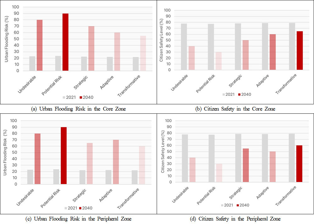 도시 침수 위험 요소 및 시민 안전성을 정량적으로 평가하고, GIS를 적용하여 공간적 변화를 분석하였다.