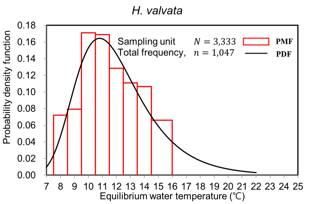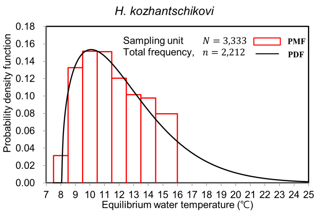 줄날도래속 3종의 서식처 적합도 분석을 위해, 각종의 출현빈도 데이터를 기반으로 평형수온을 일정 간격으로 구간화하고, 구간별 상대 출현 빈도를 집계하여