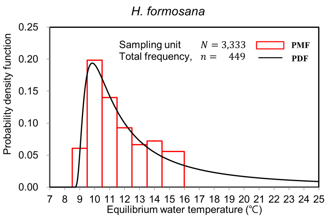 NRMSE)가 가장 낮은 값을 보인 모형을 최적으로 평가하였다(Kong et al., 2025). 선정된 분포모형의 확률밀도함수는 각종의 수온 반응 특성과 적정 서식 범위를 시각화하는 데 활용되었다. HSI 값은 PDF 값을 최빈값(Mode)에