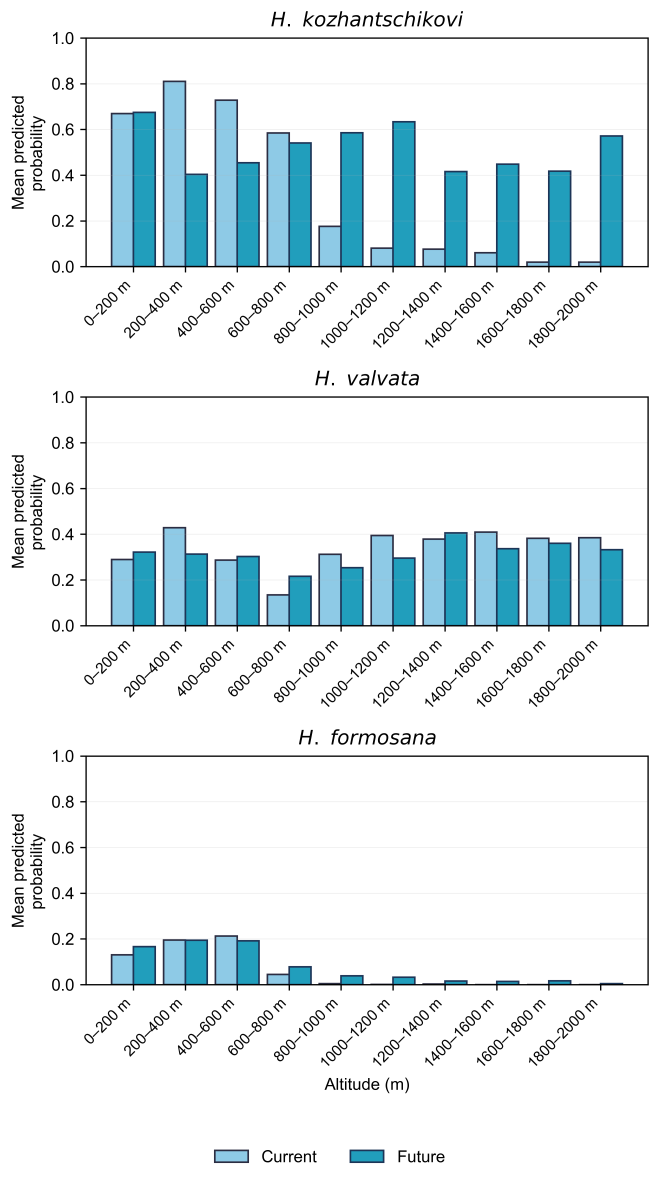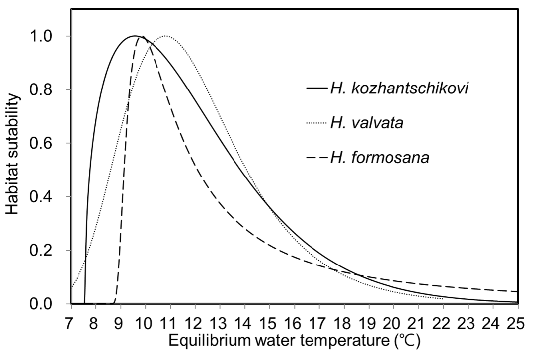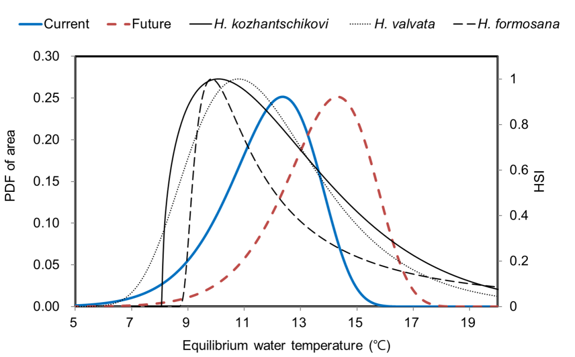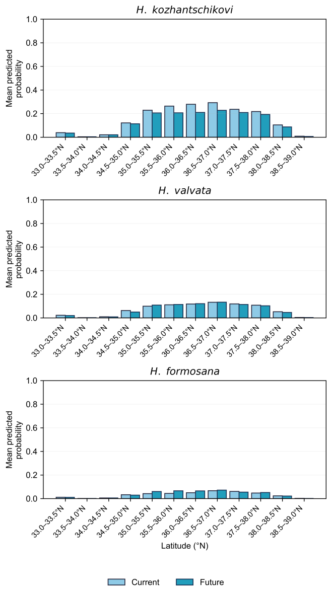 현재와 미래 조건에서 평형수온 면적 분포와 종별 HSI 곡선의 중첩을 비교한 결과, 3종 모두에서 겹치는 면적이 축소되는 경향을 보였다. H. kozhantschikovi는 상대적으로 넓은 분포 폭을 유지했으나, 미래에는 고고도로의 분포 중심 이동과 함께 적합 면적이 크게 감소하였다. H. valvata는 좁은 열 생태 폭으로 인해 미래 조건에서 급격히 서식처가 축소되어 가장 높은 기후변화 취약성을 보였다. H. formosana는 전체적으로는 서식 면적이 줄어드는 결과가 나타났다. 이러한 결과는 기후변화가 3종의 적합 서식처를 축소시킨다는 것을 나타낸다.