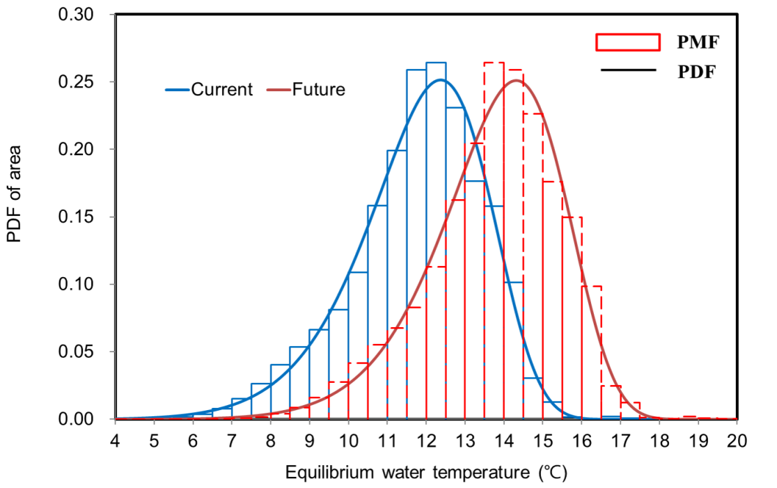 아울러, 현재 및 미래(+2.45°C 시나리오) 조건에서의 수온 구간별 가용 면적은 외부 공간자료 기반의 수온-면적 분포를 추정함으로써 산정되었고,