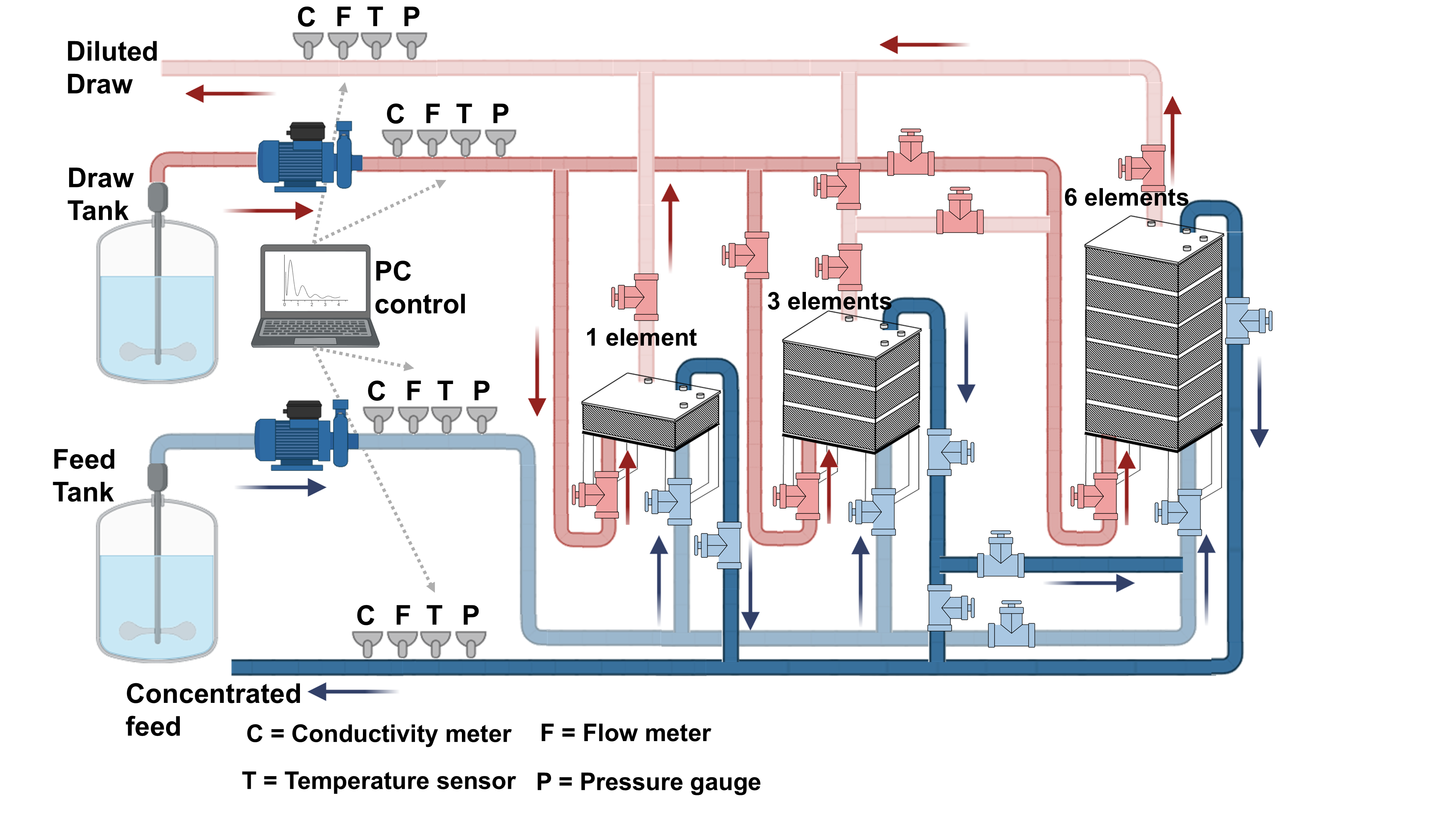 제어와 가변 주파수 드라이브(VFD)로 유량을 정밀하게 조절하였다. 공급수와 유도용액 배관의 입⋅출구에는 유량계(KTM-800; Kometer, Korea),
