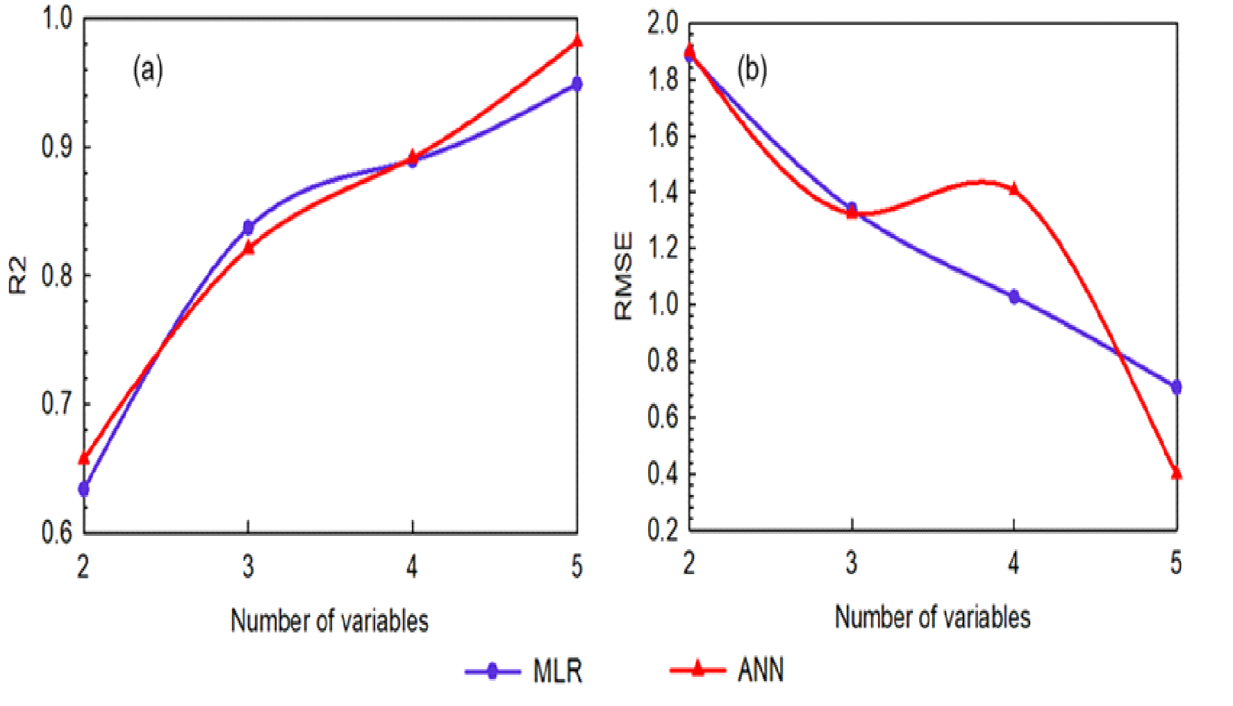 of input variables: (a) coefficient of determination (R2) and (b) root mean squared error (RMSE). Both the MLR and ANN models exhibited optimal
