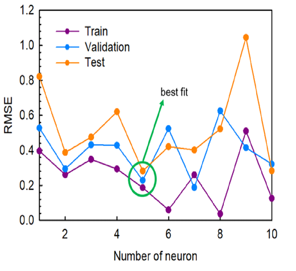 ANN 모델의 경우 은닉층 및 뉴런 수와 같은 구조적 복잡도가 모델 성능에 직접적인 영향을 미친다(Sheela and Deepa, 2013). 뉴런 수를 1-10개로 변화시키며 학습, 검증, 테스트 데이터셋에 대한 RMSE를 비교한 결과, 뉴런 수가 5개일 때 모든 데이터셋에서 오차가