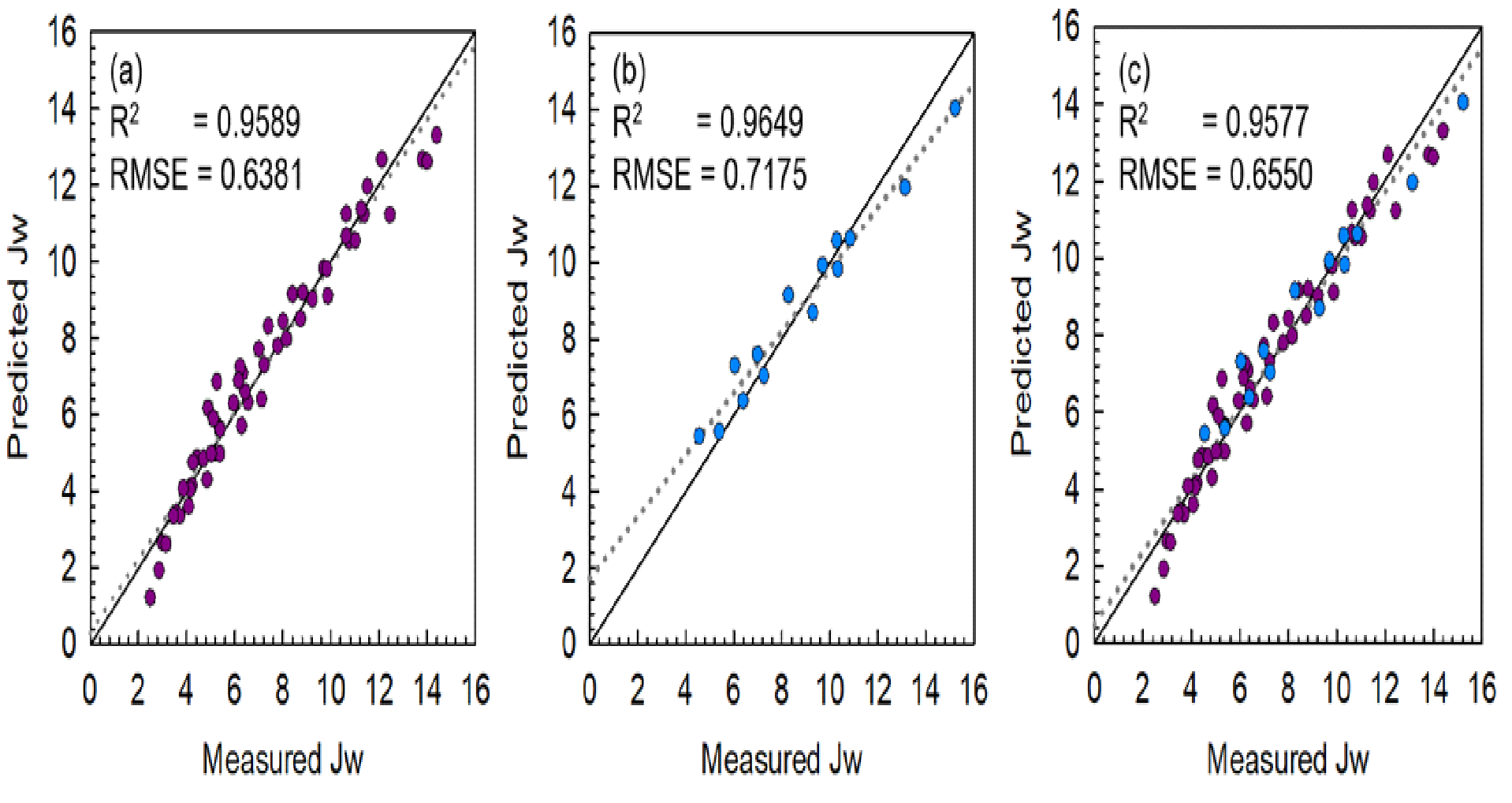 앞선 3.2와 3.3 절에서 제시된 MLR과 ANN 모델의 성능을 비교하면, 두 모델 모두 정삼투 막 모듈의 수투과 플럭스를 높은 정확도로 예측하였다(두