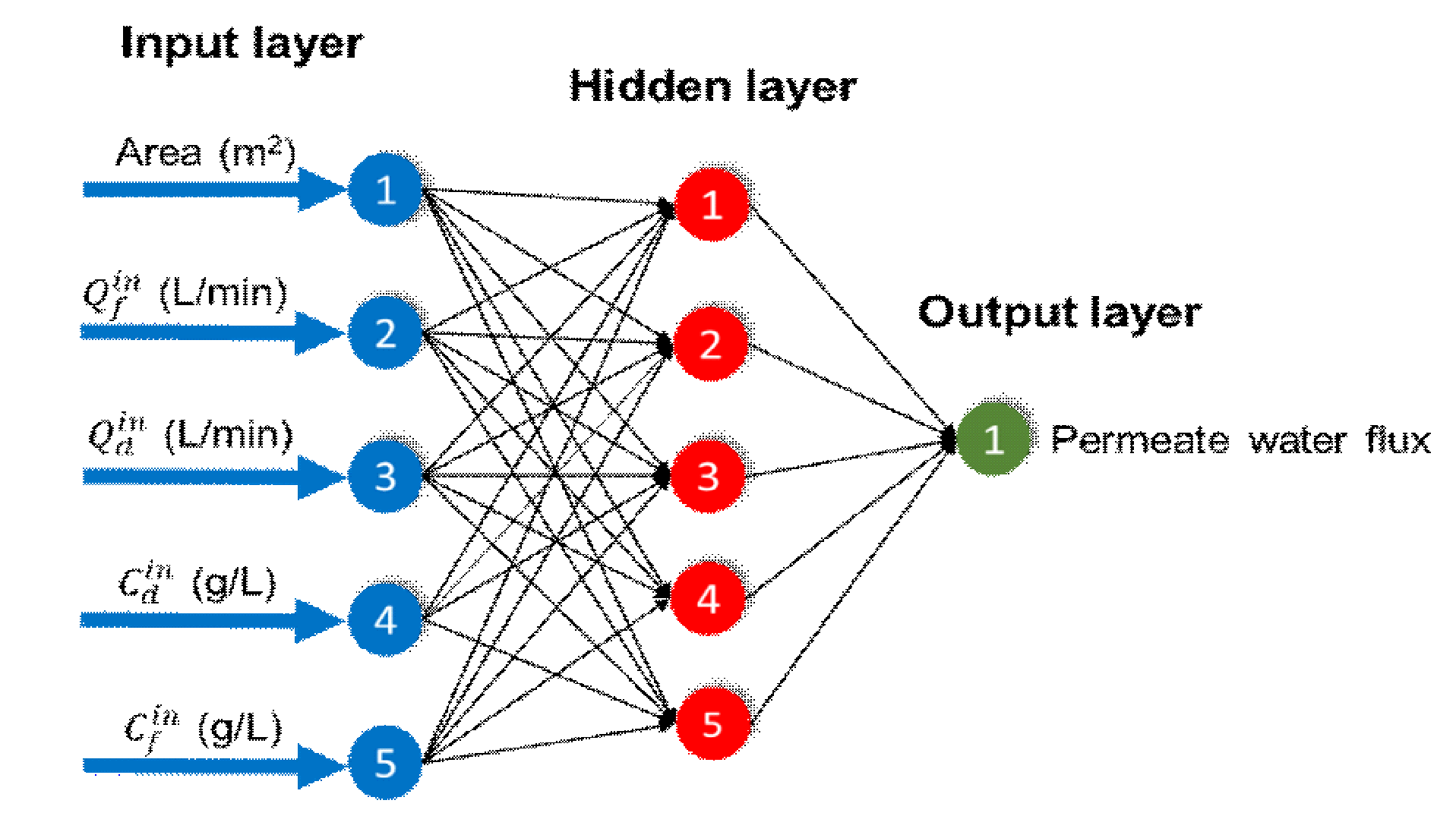 공급수 유량, 공급수 농도, 유도용액 유량, 유도용액 농도의 다섯 개 변수가 포함되었다. 은닉층은 최적화 과정을 통해 뉴런 수 5개를 배치하였으며,