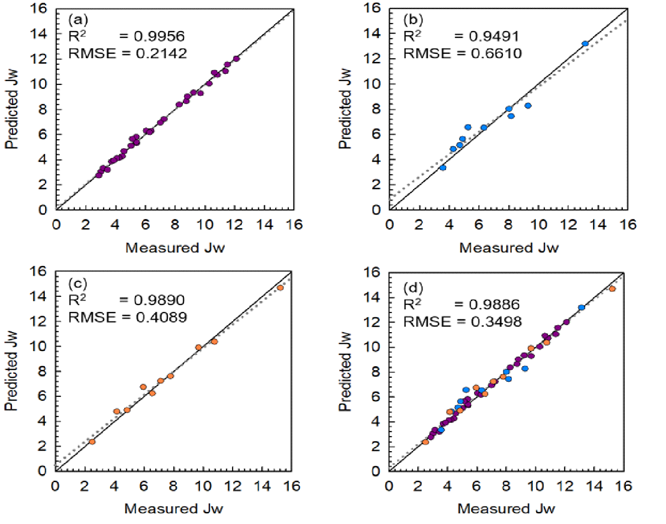 안정적으로 플럭스를 예측할 수 있음을 확인하였다(Fig. 7). RMSE 값은 학습, 검증, 테스트 데이터셋에서 각각 0.2142, 0.6610, 0.4089 L m-2 h-1로 나타났으며, 전체 데이터셋 기준으로는 R2=0.9886, RMSE = 0.3498 L m-2 h-1을 기록하였다. 이는 ANN 모델이 데이터의 변동성을 효과적으로 추종하고, 평균적인 예측 오차가 매우 작은 수준임을 의미한다.