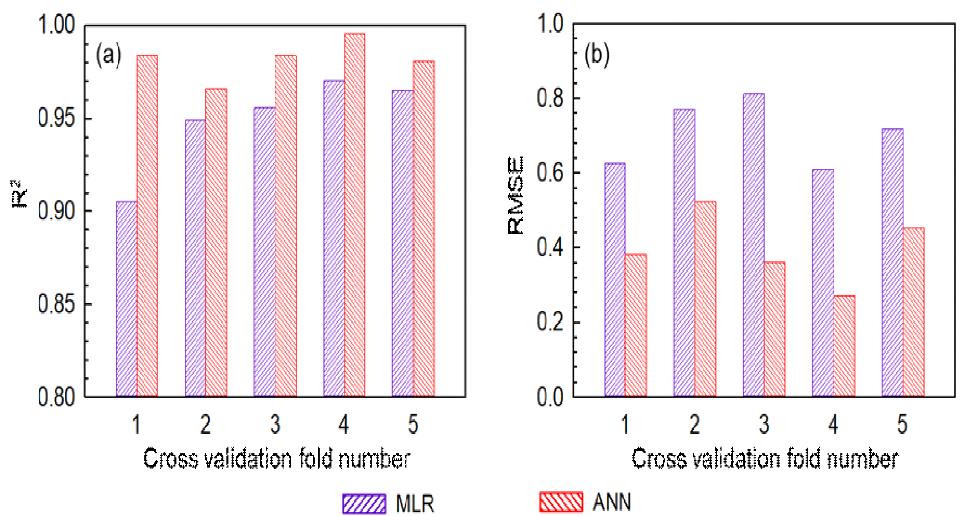 Fig. 8. K-fold cross-validation results comparing MLR and ANN model performance: (a)