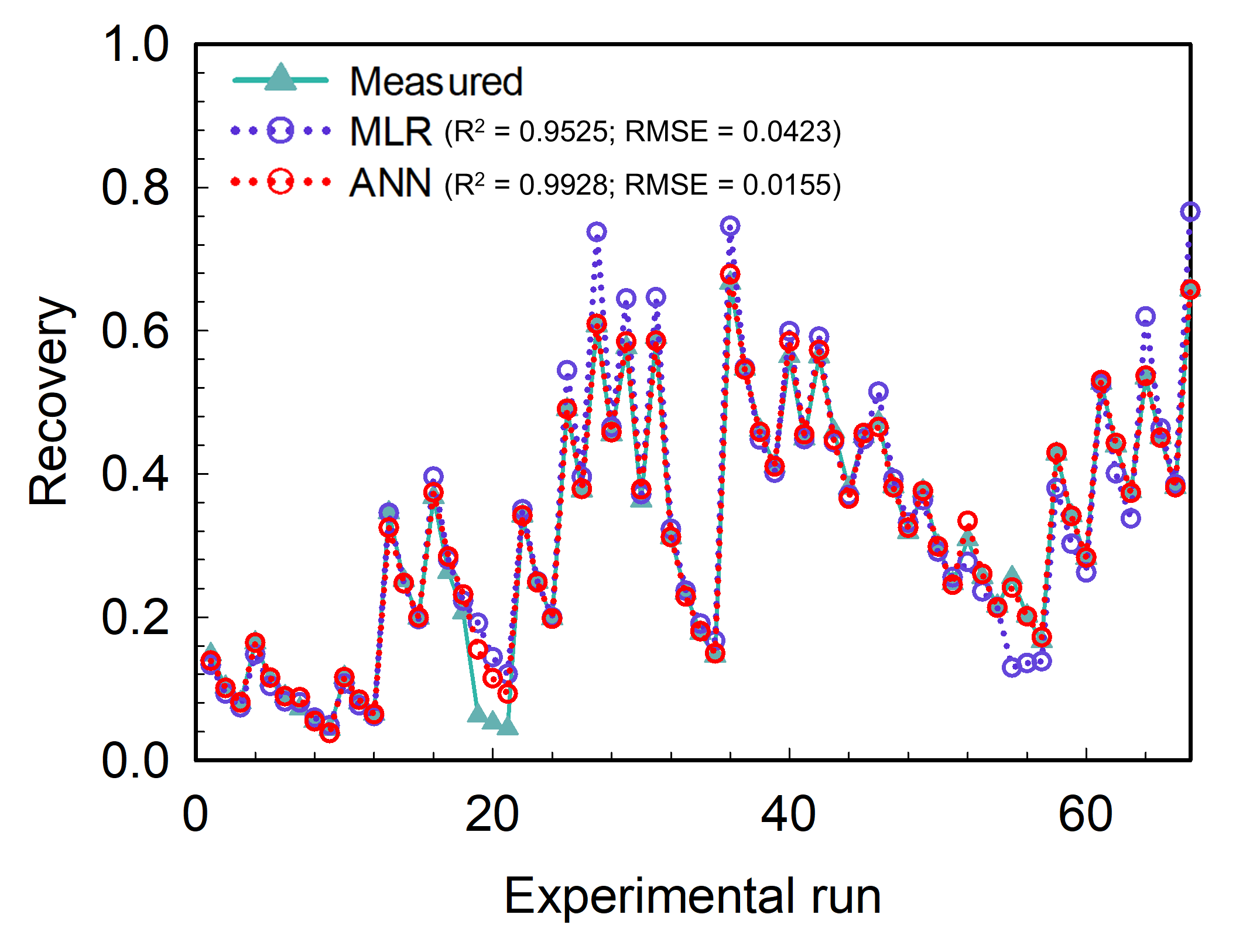 이러한 결과는 두 모델 모두 회수율 예측에 실용적으로 활용 가능함을 보여준다(R2 > 0.95). MLR은 각 변수의 영향을 명확히 제시하여 공정 이해와 운전 전략 수립에 유용하며, ANN은 약간 더 높은 예측 정밀도를 제공하여