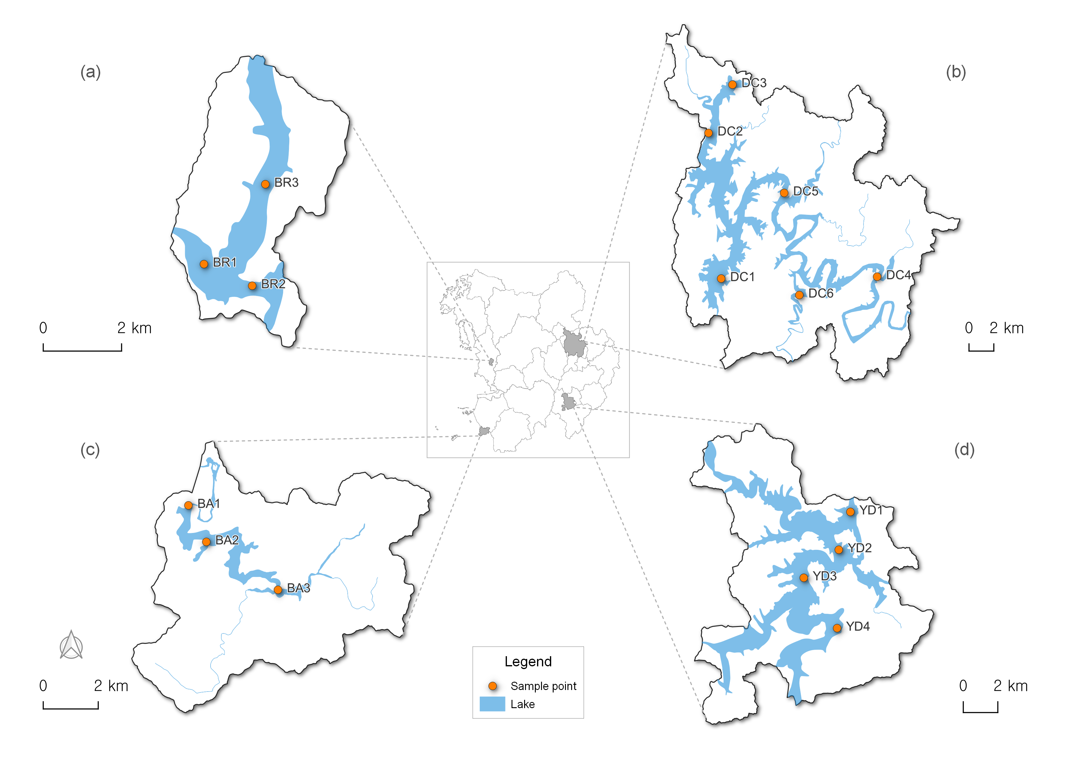Fig. 1. Map showing the locations of sampling points in the study lakes: (a) Boryeong,