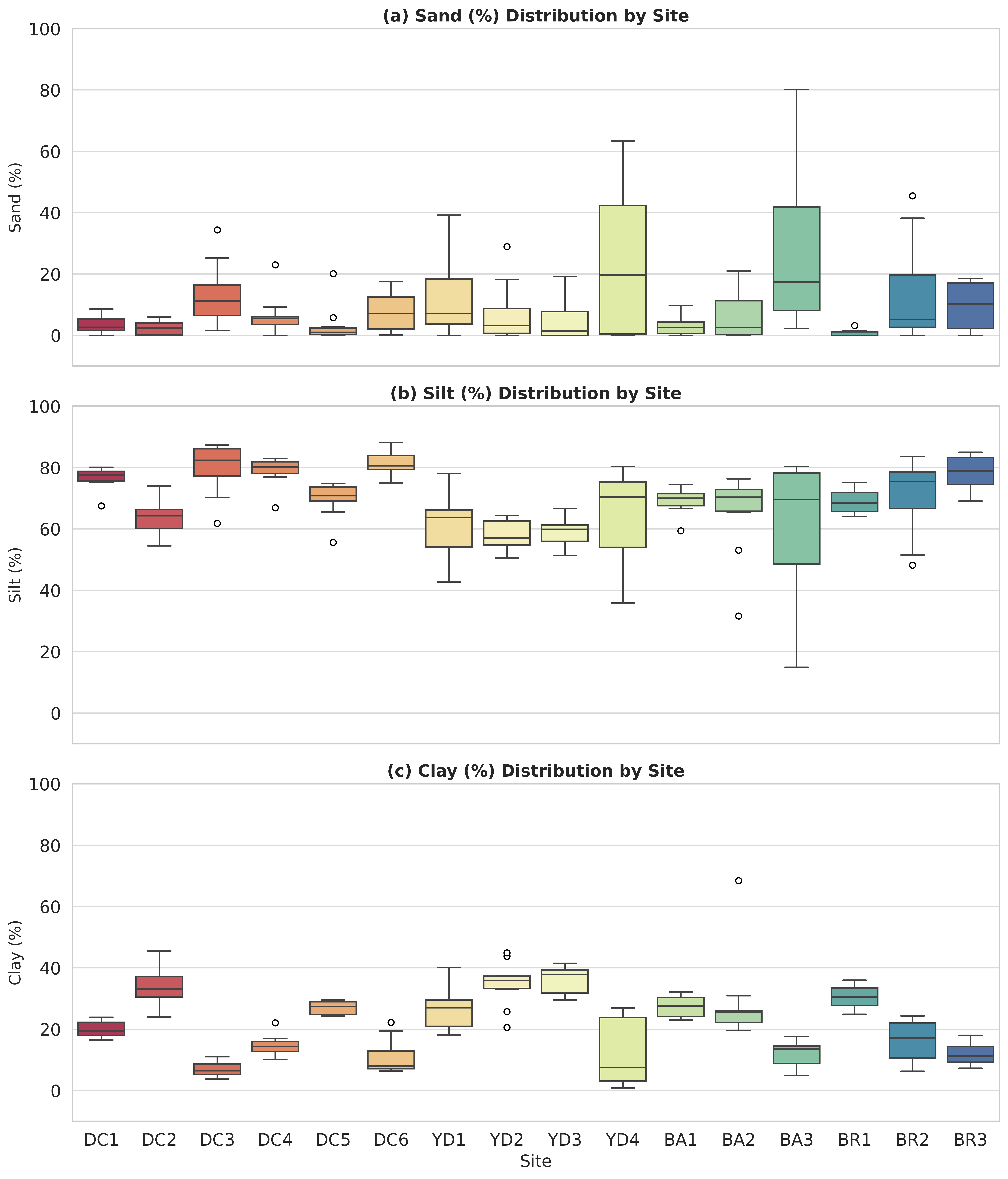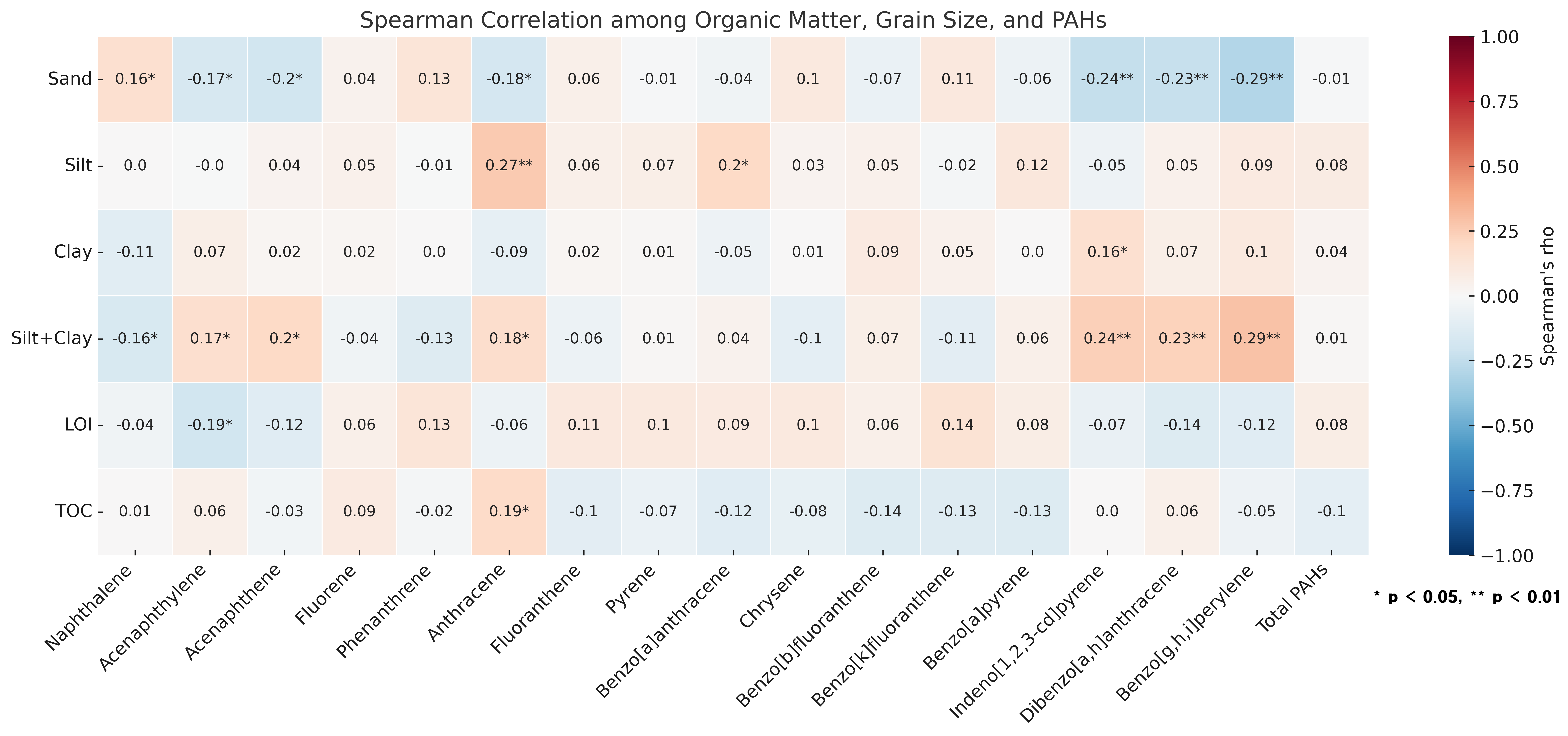 있다(Gao et al., 2024; Han et al., 2021; Maslennikova et al., 2012). 입자가 미세할수록(특히 점토 및 실트) 표면적이 넓고 흡착력이 커서 중금속과 유기오염물질의 축적이 촉진되며, 유기물 함량 역시 PAHs와 같은