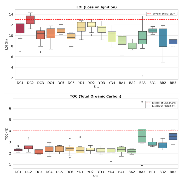 퇴적물 내 오염물질의 분포와 축적 정도는 입도, 유기물 함량(LOI, TOC), 그리고 인위적⋅자연적 오염원 등 다양한 환경 인자와 밀접하게 관련되어