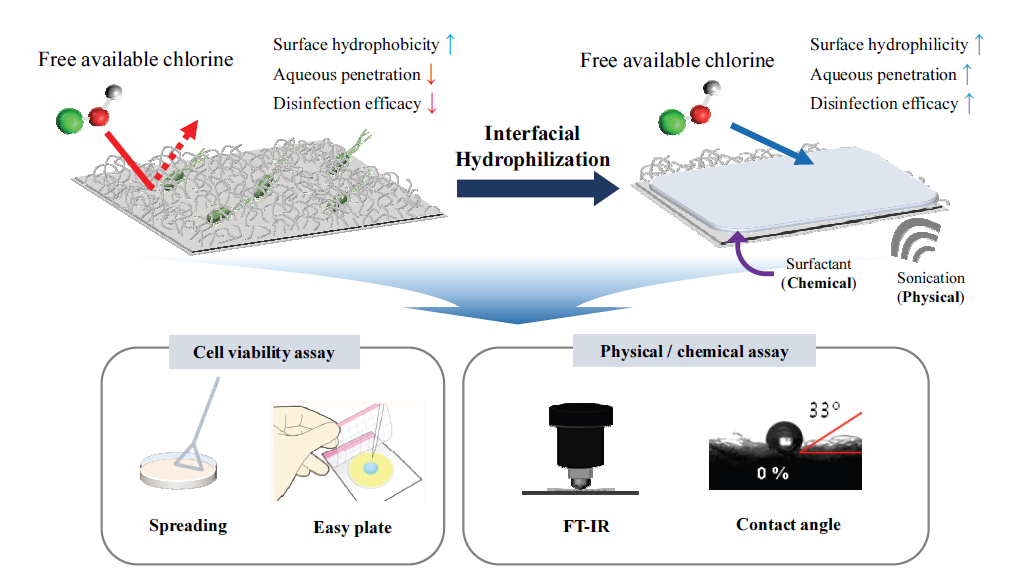 방식으로 적용하고, 각 소독 효율을 체계적으로 비교⋅평가하였다. 더불어, 접촉각(contact angle) 측정과 퓨리에 변환 적외선 분광기(Fourier-transform