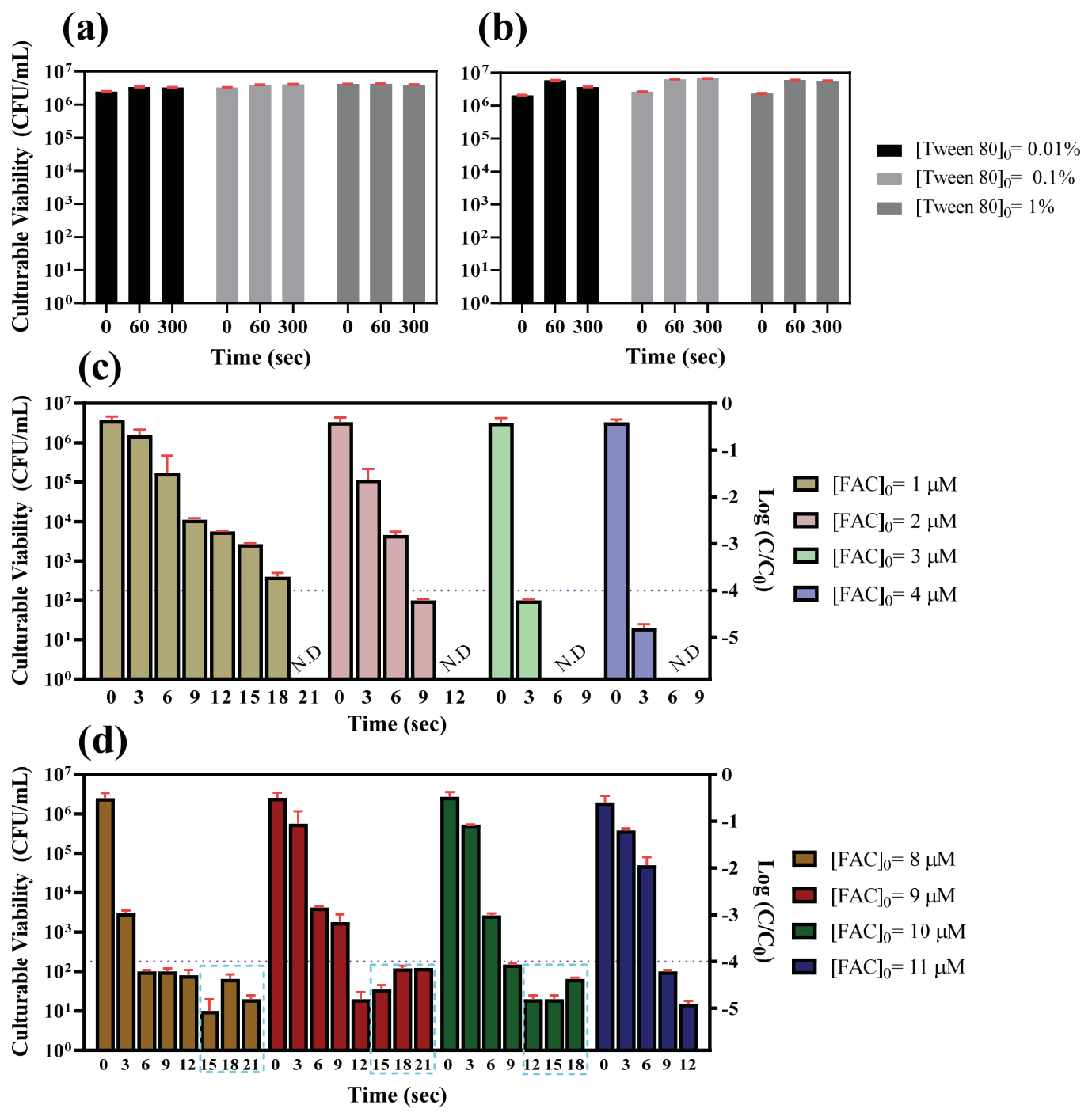 계면활성제 트윈 80(Tween 80), 그리고 보편적인 산화제인 유리염소(free available chlorine, FAC)를 단독 및 복합 처리