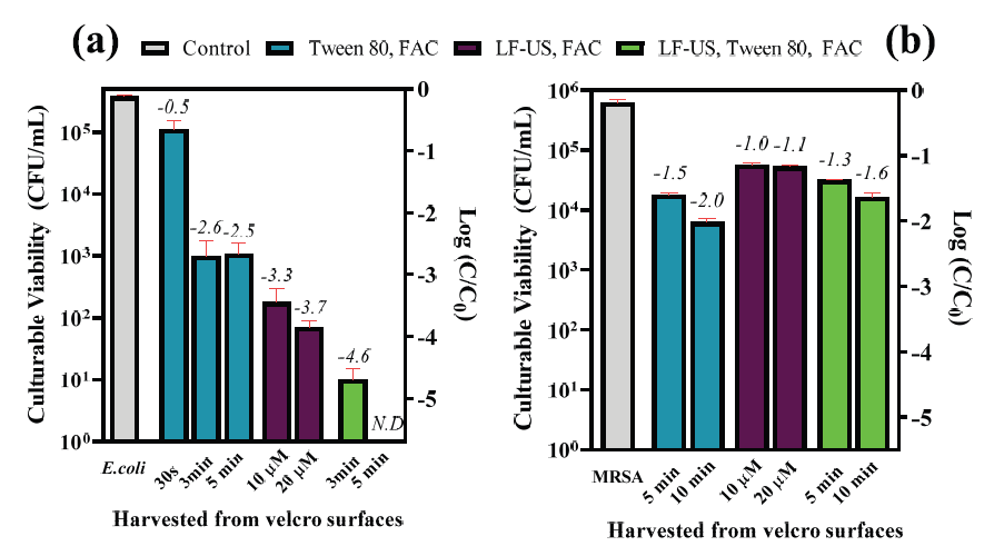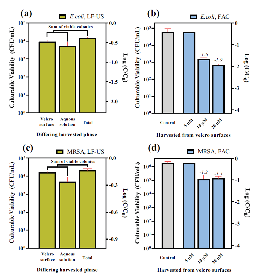 메티실린 내성 황색포도상구균(MRSA)을 대상으로, 소수성 벨크로(Velcro) 표면에 잔류하는 상황을 모사한 인위적 오염 및 회수(harvesting)