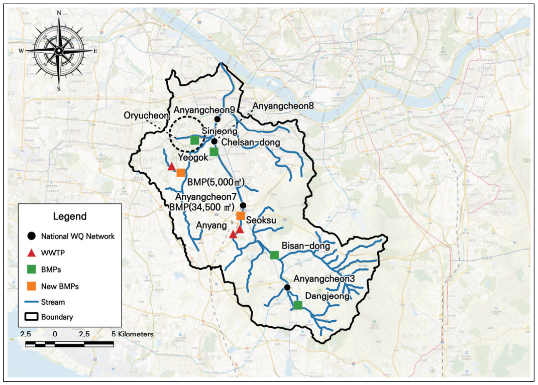 안양, 석수 및 역곡 하수처리장 인근과 유역 최하류인 안양천9으로 선정하였고, 결과는 Table 6에 정리하였다. 석수 하수처리장 인접지에 BMPs를 설치한 경우, BOD는 3.929 mg/L에서 3.913 mg/L로 감소하여 0.42%의 저감률을