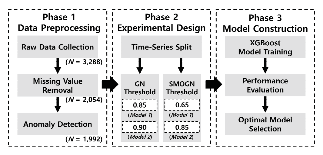 따라서 본 연구에서는 IForest를 이용한 전처리, SMOGN을 이용한 데이터 증강, 그리고 XGBoost를 이용한 예측 모형 구축의 3단계 프로세스를