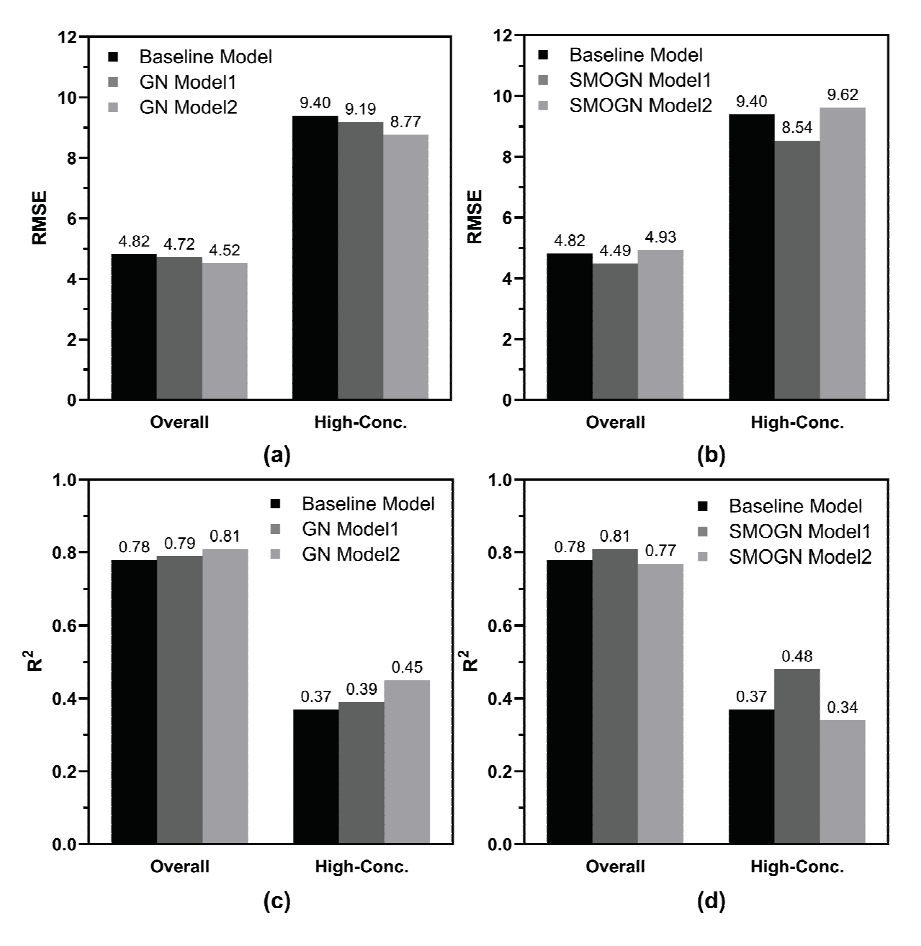 GN Model 1과 GN Model 2의 전체 RMSE는 각각 4.72 µg/L, 4.52 µg/L로 감소하였으며, R2는 각각 0.79, 0.81으로 소폭 향상되었다. 고농도 구간에서 GN Model 2는 R2 0.45를 기록하여 Baseline 대비 약 22.2%의 성능 개선을 확인하였다. 이는 노이즈 주입을 통한 데이터 보강이 모델의 일반화 성능 향상에