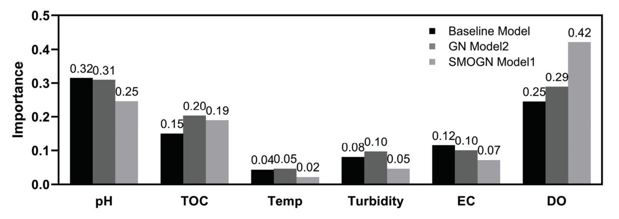 XGBoost 알고리즘의 gain 지표를 기반으로 산출된 feature importance 결과는 Fig. 6와 같다. 모든 모형에서 pH와DO가 가장 영향력 있는 인자로 도출되었다. Baseline 모형의 경우 pH의 중요도가 0.32로 가장 높았으며,