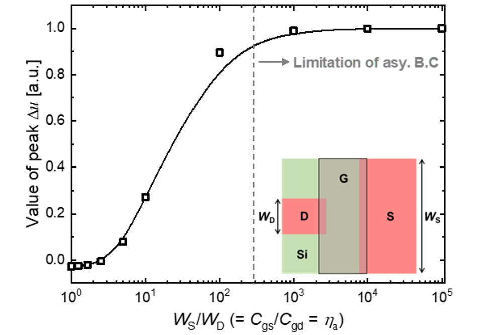 the source/drain areas. However, when the asymmetry factor ($\eta_{\rm a}$) exceeds