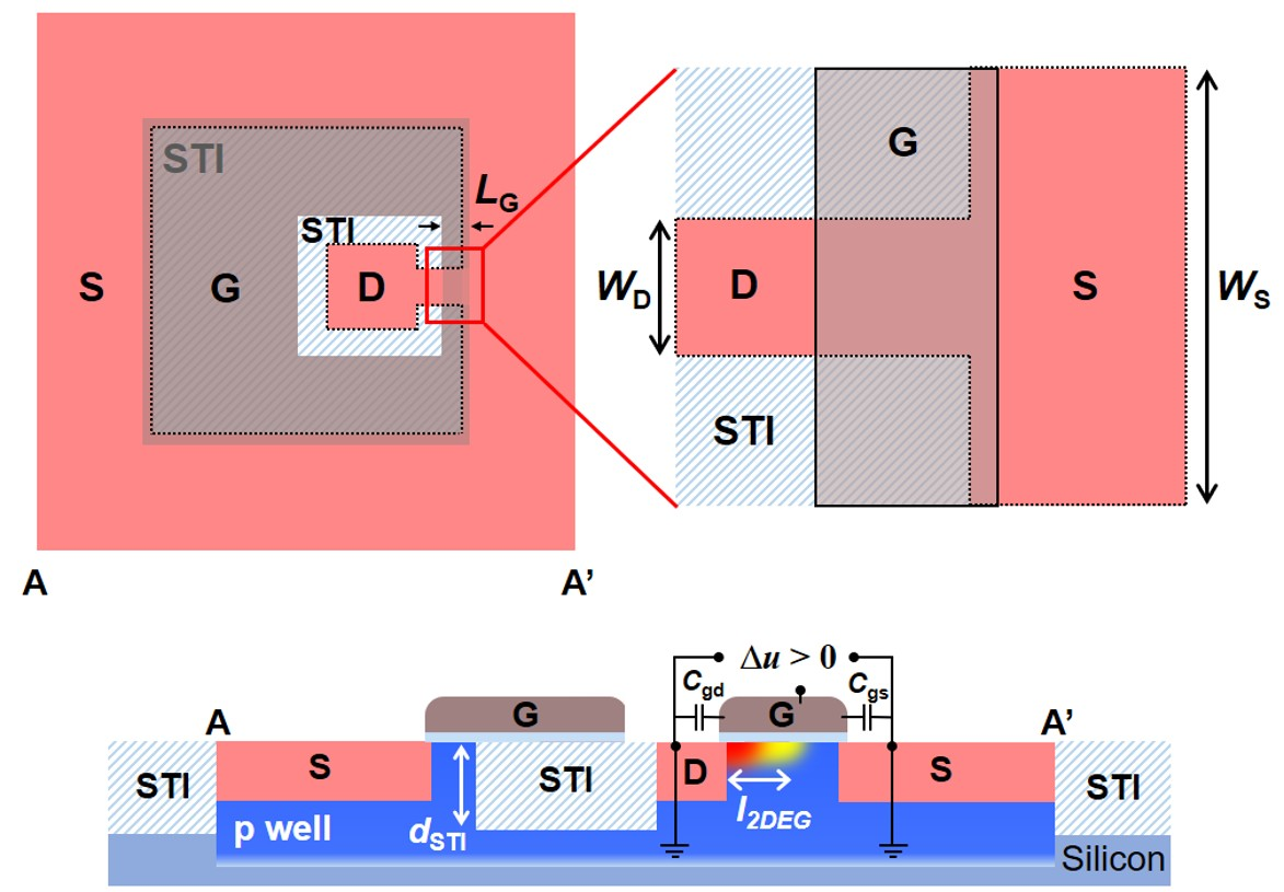 trench isolation (STI). The simulated trantenna has a ${L}_{\rm G}= 200$ nm, fixed
