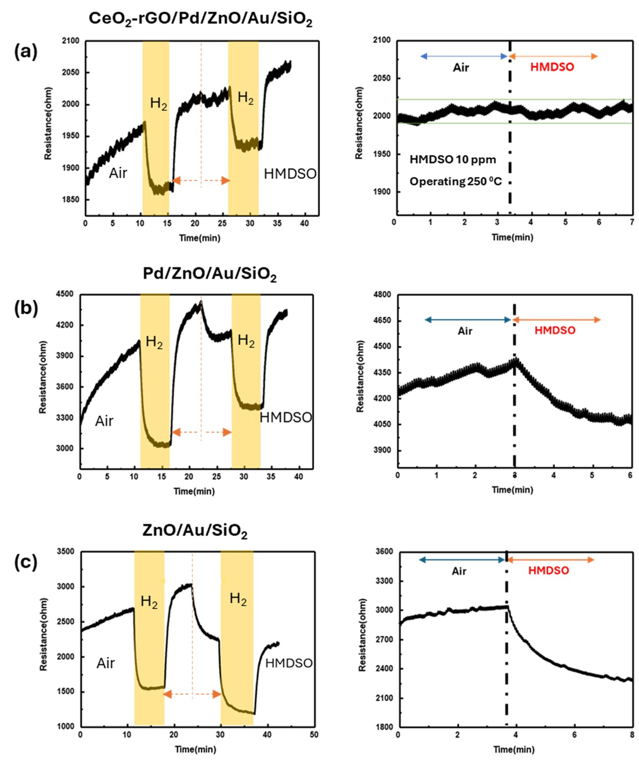 for HMDSO poison elimination and H${}_{2}$ detection at 250$^\circ$C. The Anti-poisoning