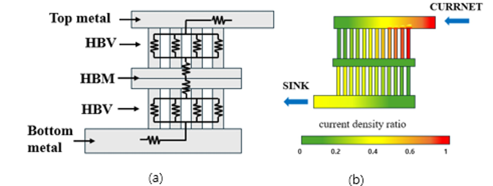 bonding metal (HBM) exhibited the highest current density. Modeling all vias in parallel