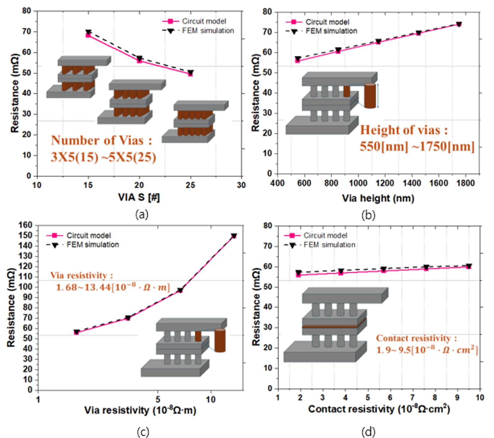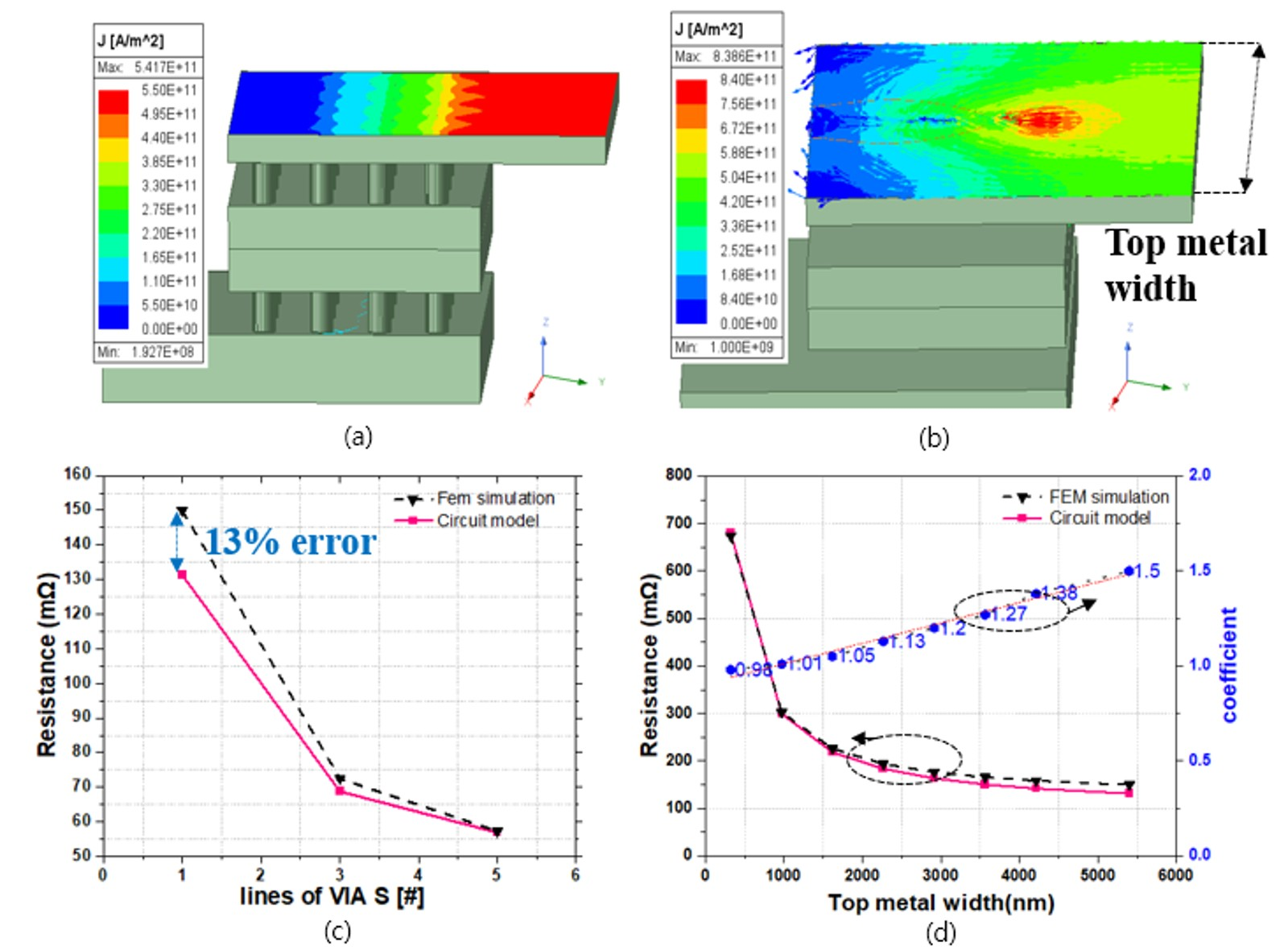 layer. This modification accurately reflects the FEM simulation result in Fig. 2(b), where current density is lowest in the leftmost via and highest in the via closest