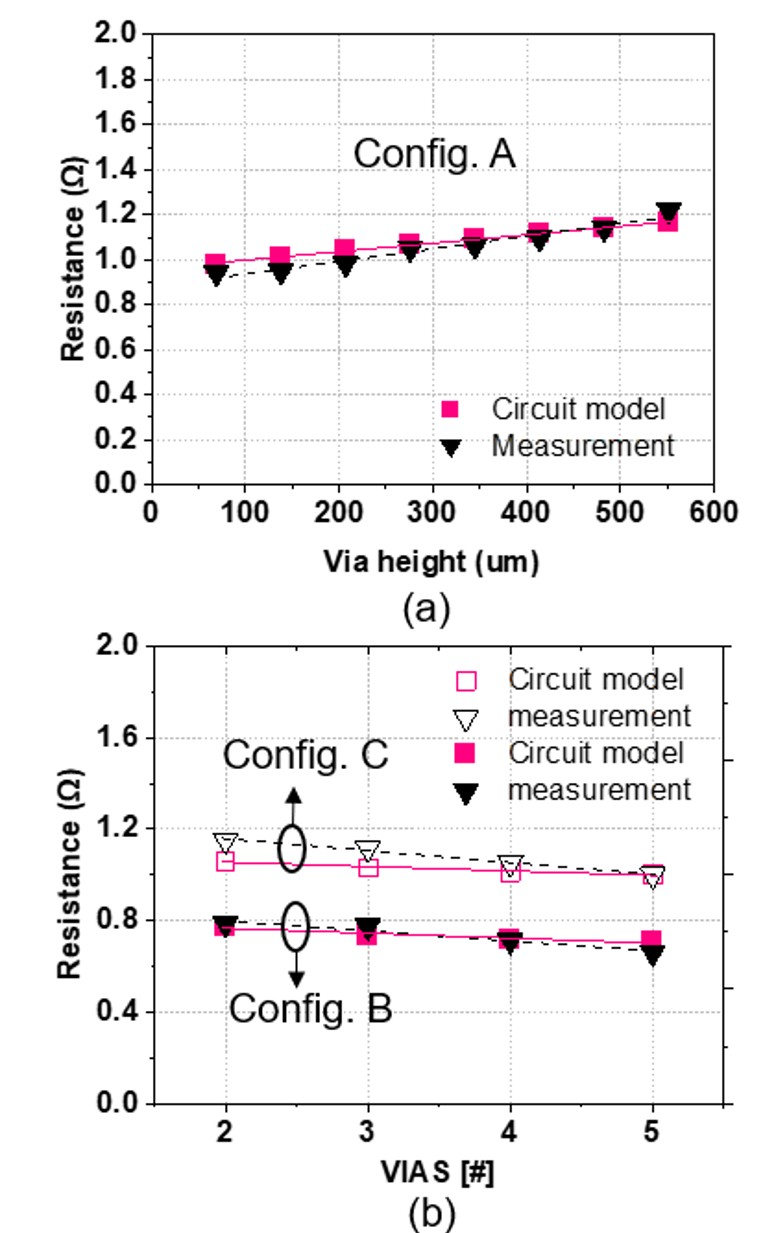 Fig. 2(a) presents a simple circuit model using dimensions and metal resistivity [12]. The dual damascene hybrid bonding structure is divided into three main parts in