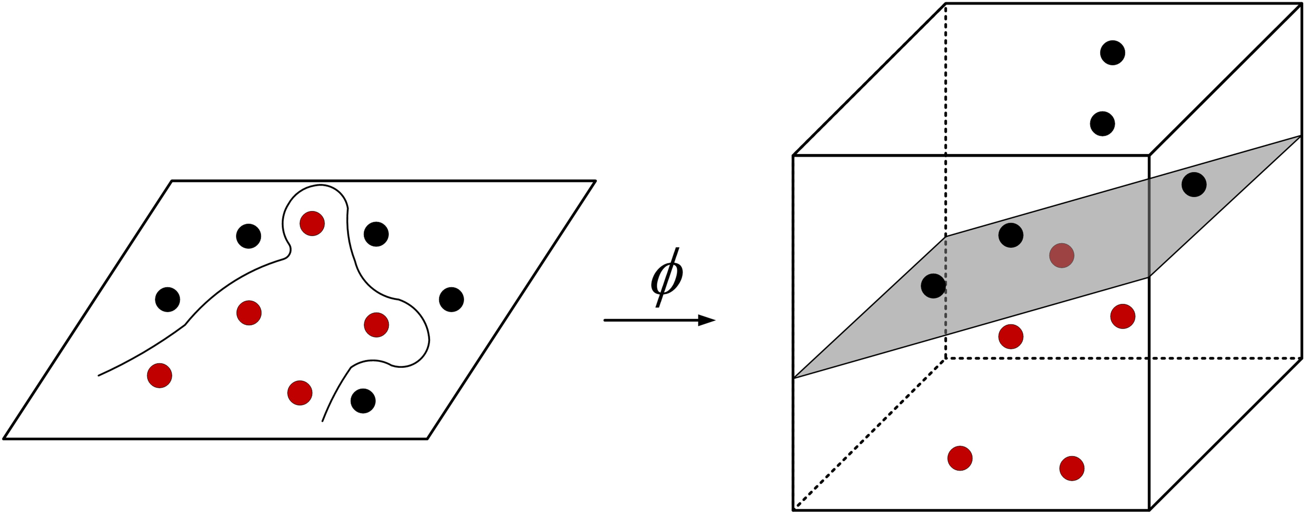 feature space and increases the probability of linear classification as shown in Fig. 3; and ${k}(x_{i}$, $x_{j})$ is a kernel function that can be used to calculate the