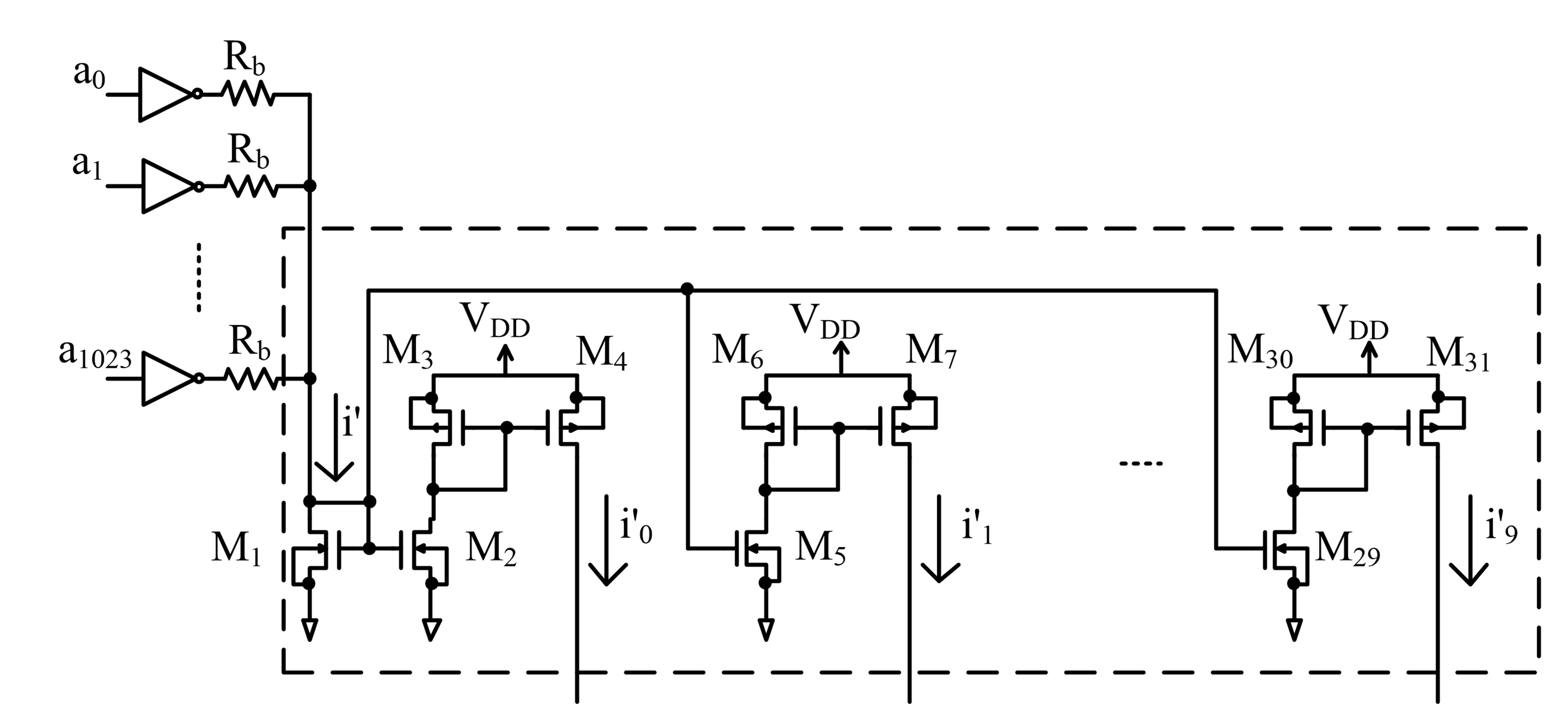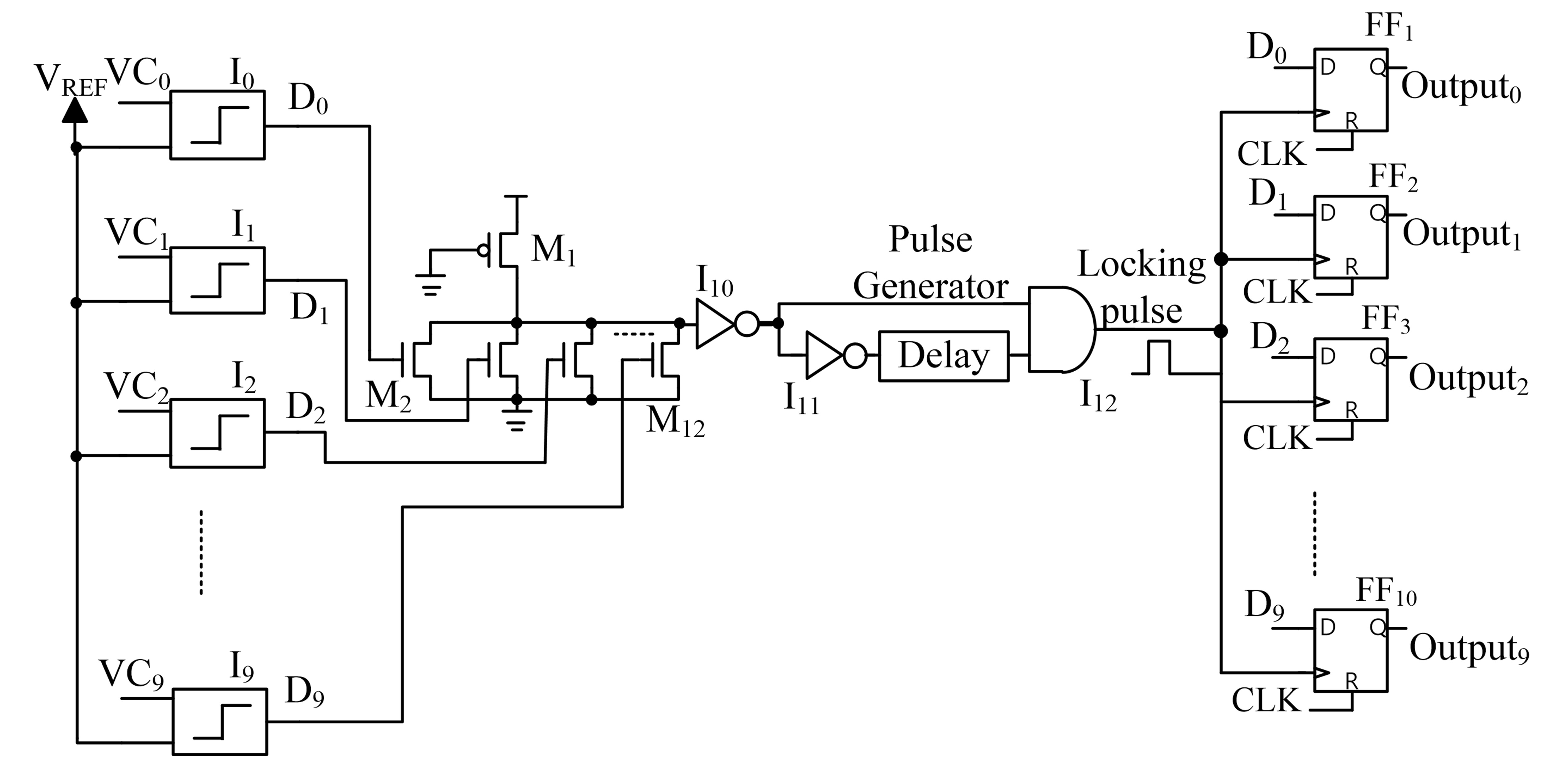 [27,29]. The comparators $I_0$ to $I_9$ compare these voltages to the reference voltage $V_{REF}$
