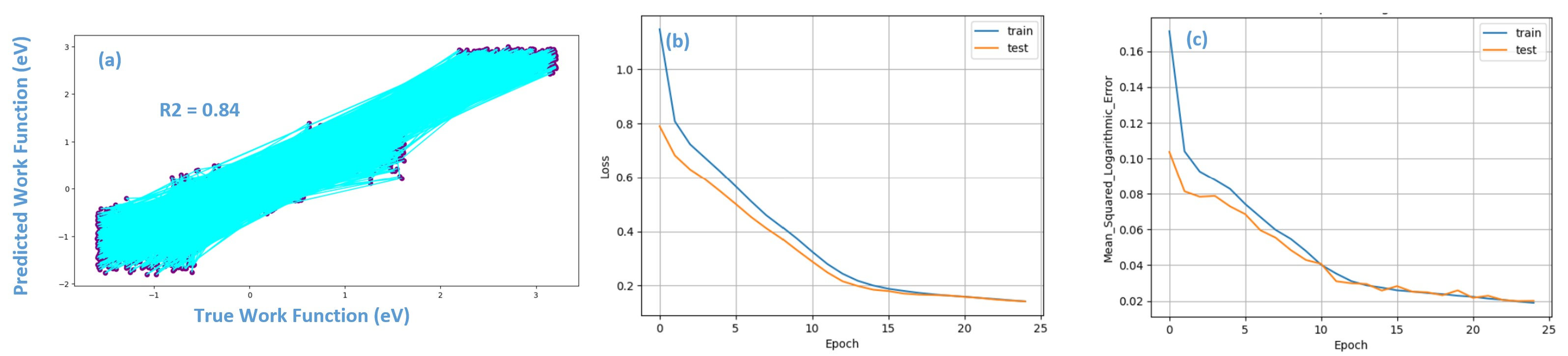 high R2 score. Fig. 4 depicts the performance of neural network regression. Fig. 4(a) exhibits Predicted work function Vs True Work function with 0.84 R2 score. Figs. 4(b) and 4(c) depict Loss Vs Epoch and Mean Squared Logarithmic Error Vs Epoch. Both of the cases,