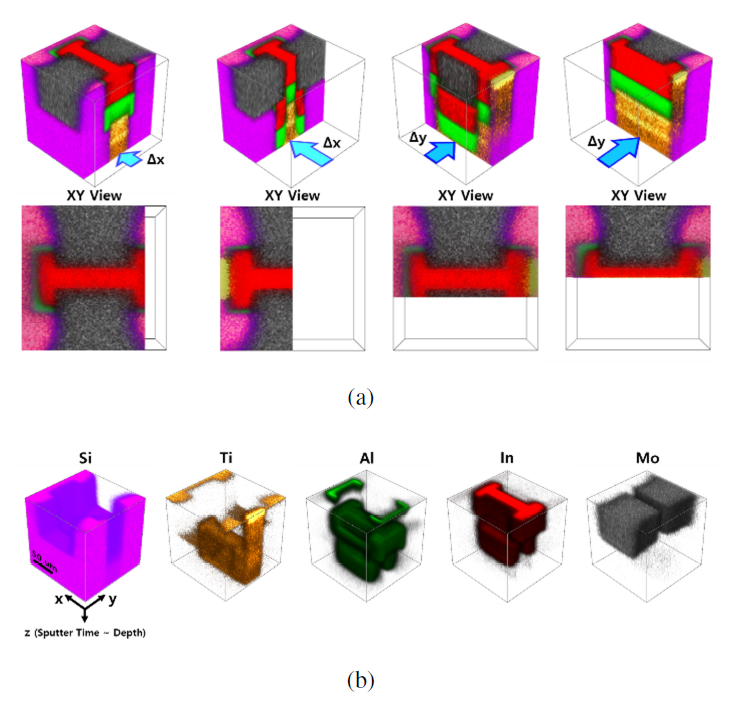 Fig. 10. 3D imaging by TOF-SIMS at (a) XY view, and (b) each element such as Si, Ti,