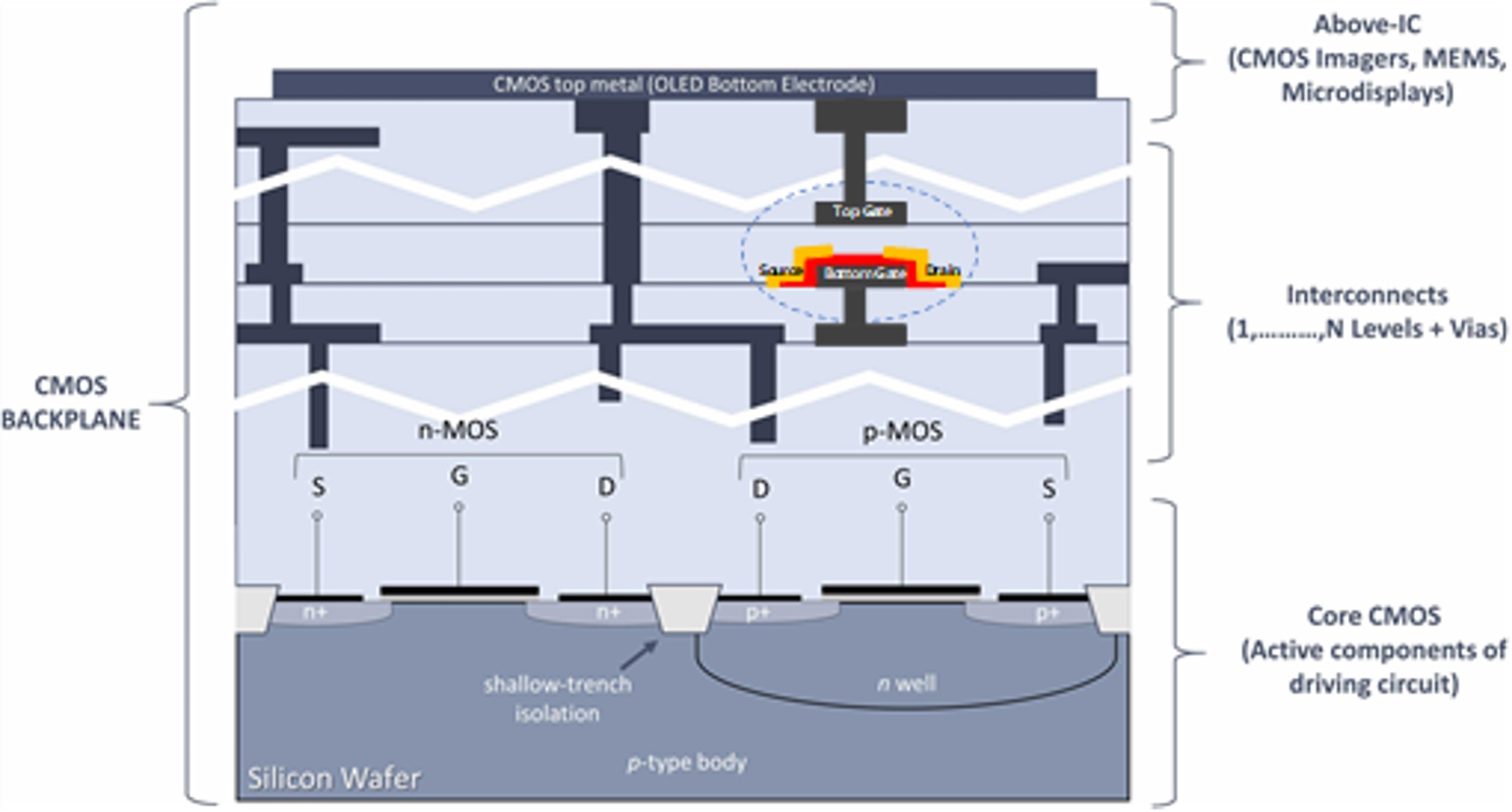 Fig. 2. A cross-sectional illustration of IGZO TFT based on a typical CMOS backplane.