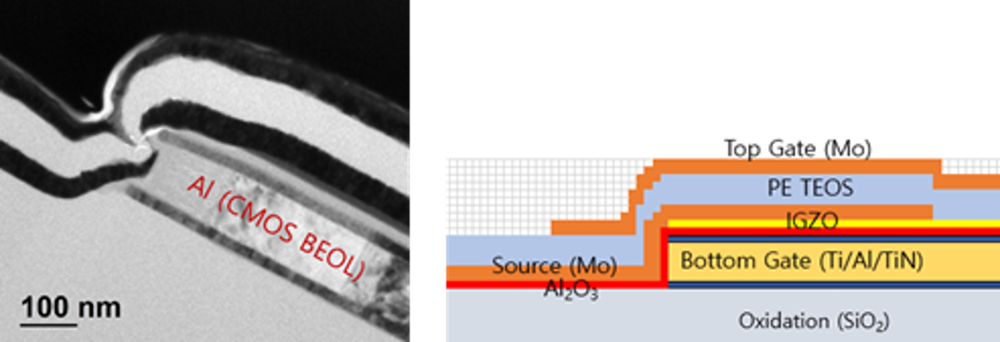 was, bottom and top gate electrode at CMOS BEOL process integration. Al2O3 was for BG and SiO2 for top gate. Inter metal dielectric (IMD) at CMOS BEOL process was used at PE-Oxide