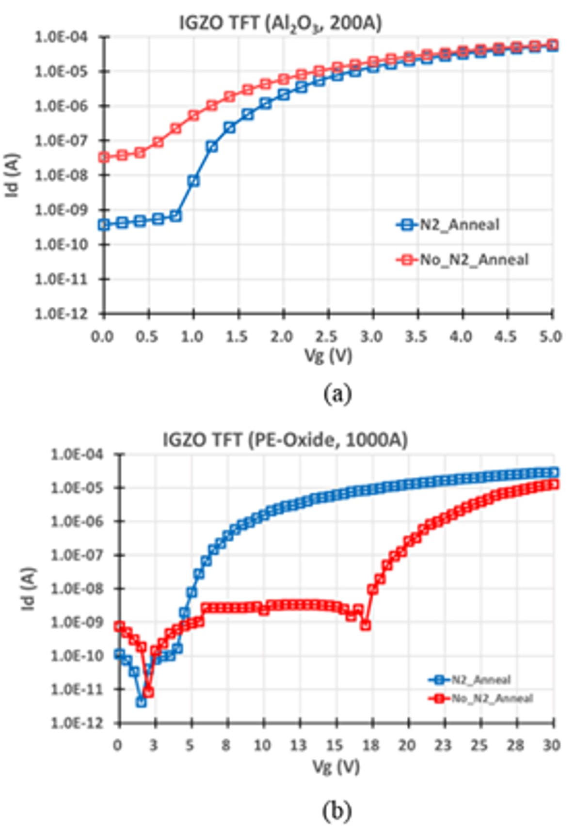 subthreshold swing (SS) at the Al2O3 condition. The N2_anneal was steep and the No_N2_anneal was slow.